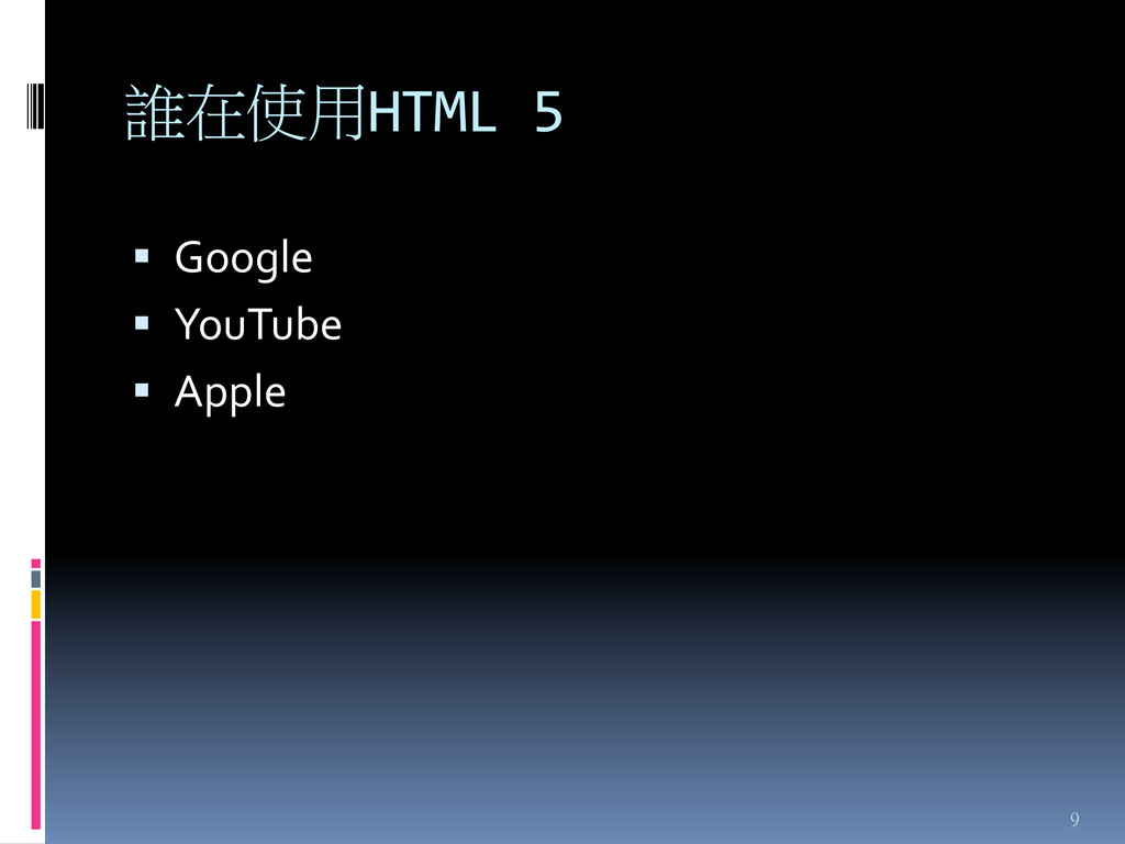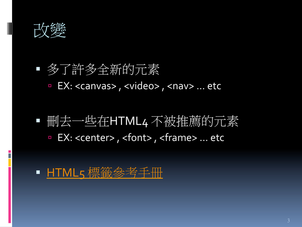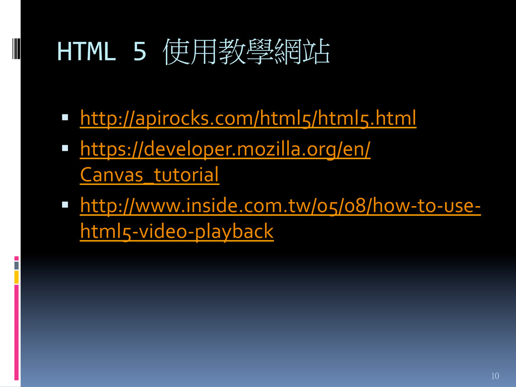 參考資料 § http://www.w3schools.com/ § http://en.wikipedia.org/wiki/Html5 § http://www.w3.org/TR/html5/