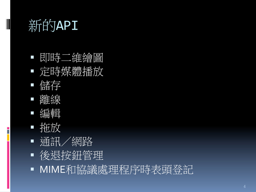 新的API § 即時二維繪圖 § 定時媒體播放 § 儲存