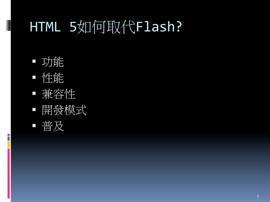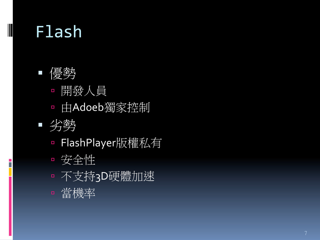 § 劣勢 ú FlashPlayer版權私有 ú 安全性 ú 不支持3D硬體加速 ú 當機率 7