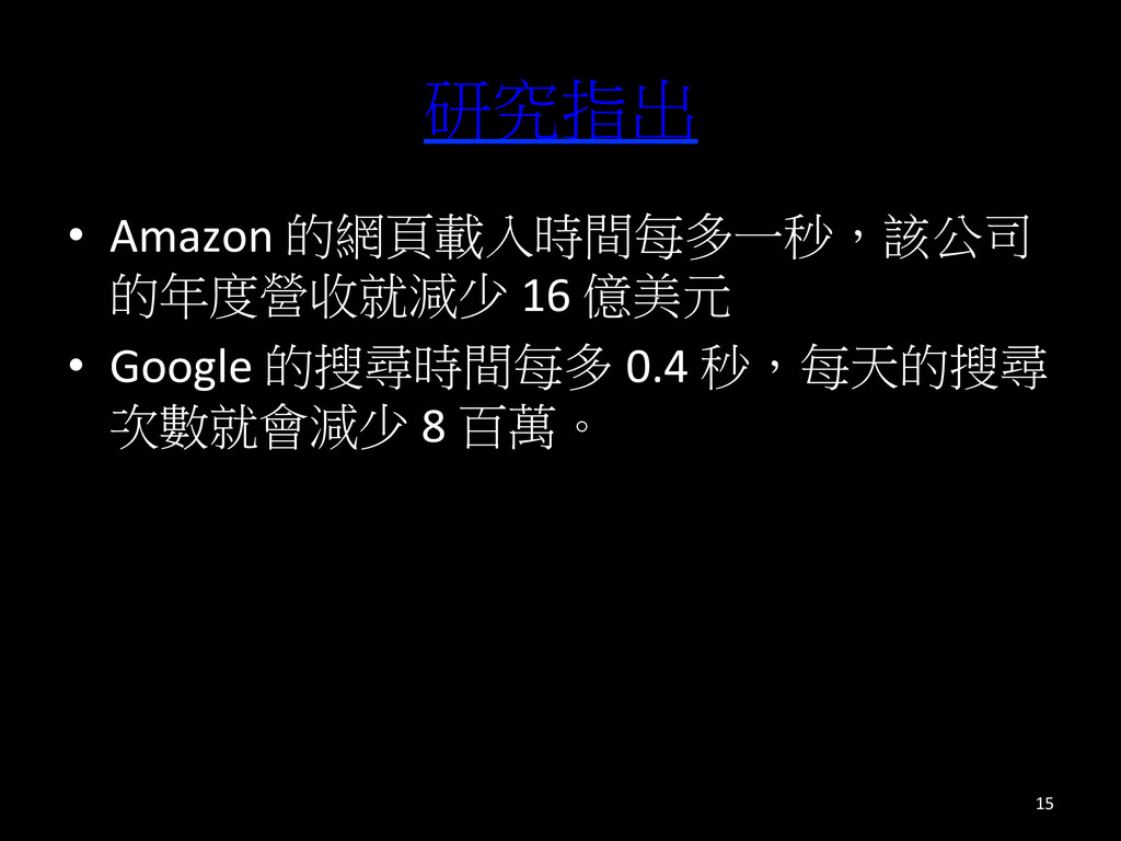 研究指出 • Amazon 的網頁載入時間每多一秒,該公司 的年度營收就減少 16 億美元 • Google