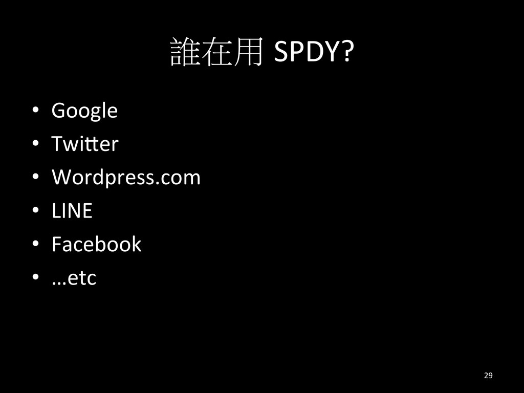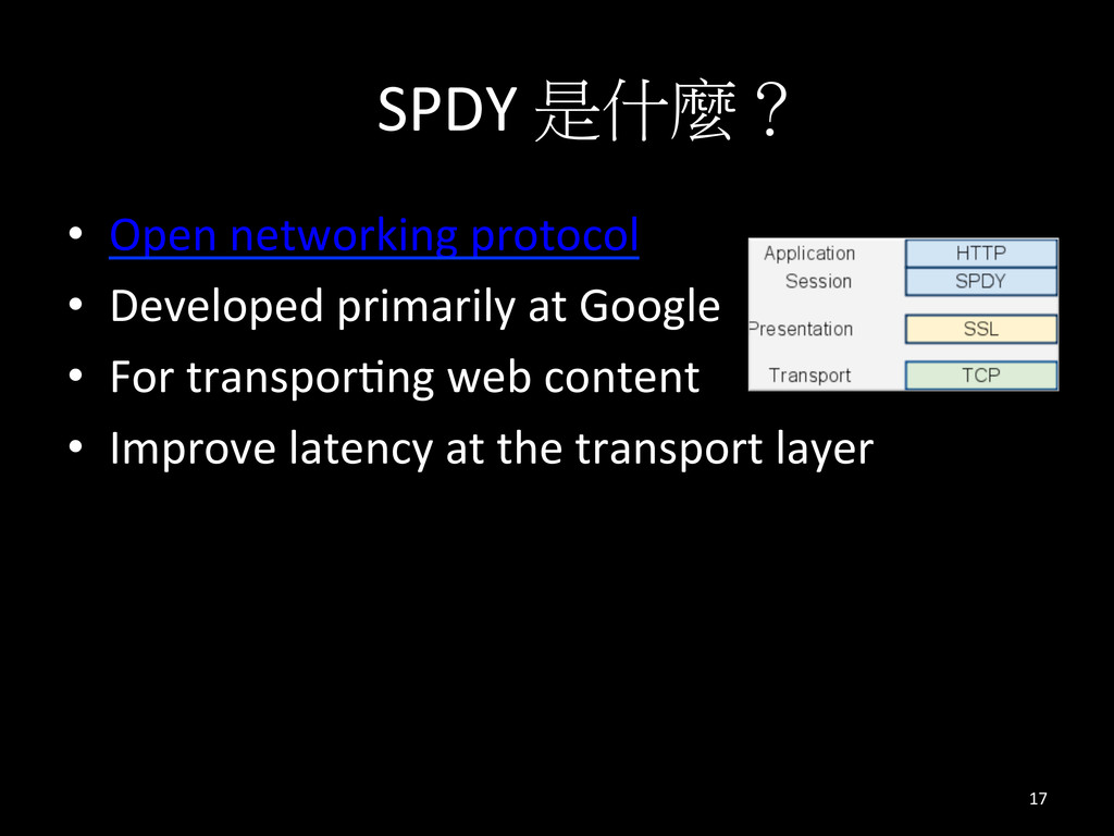 SPDY 是什麼? • Open networking protocol • Developed primarily at