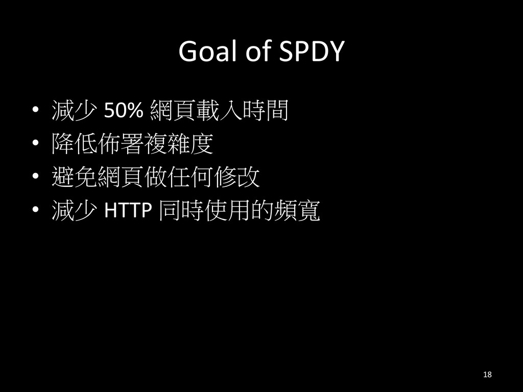 Goal of SPDY • 減少 50% 網頁載入時間 • 降低佈署複雜度