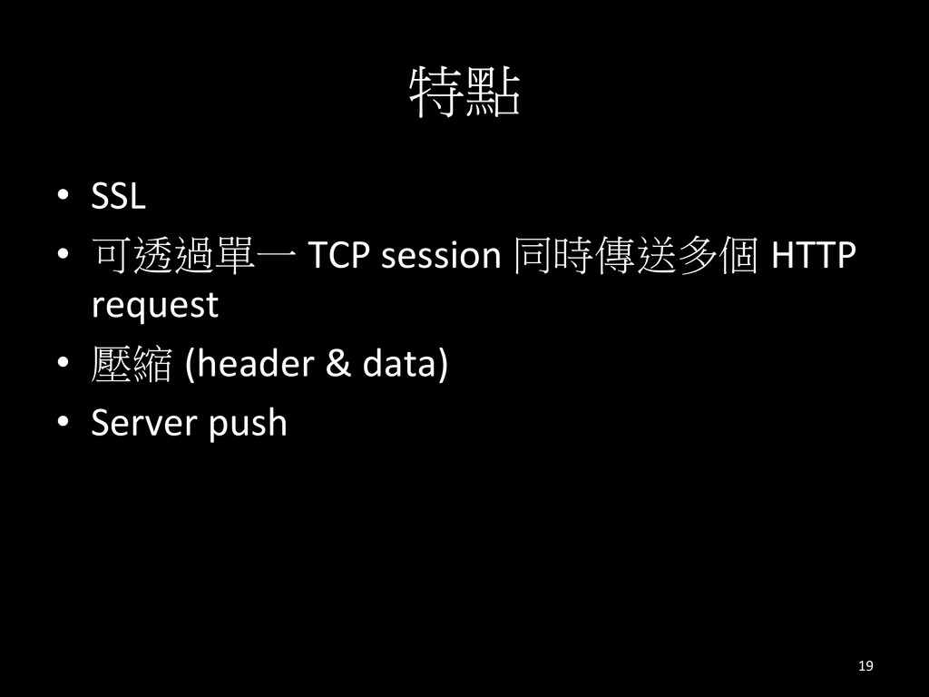 特點 • SSL • 可透過單一 TCP session 同時傳送多個 HTTP