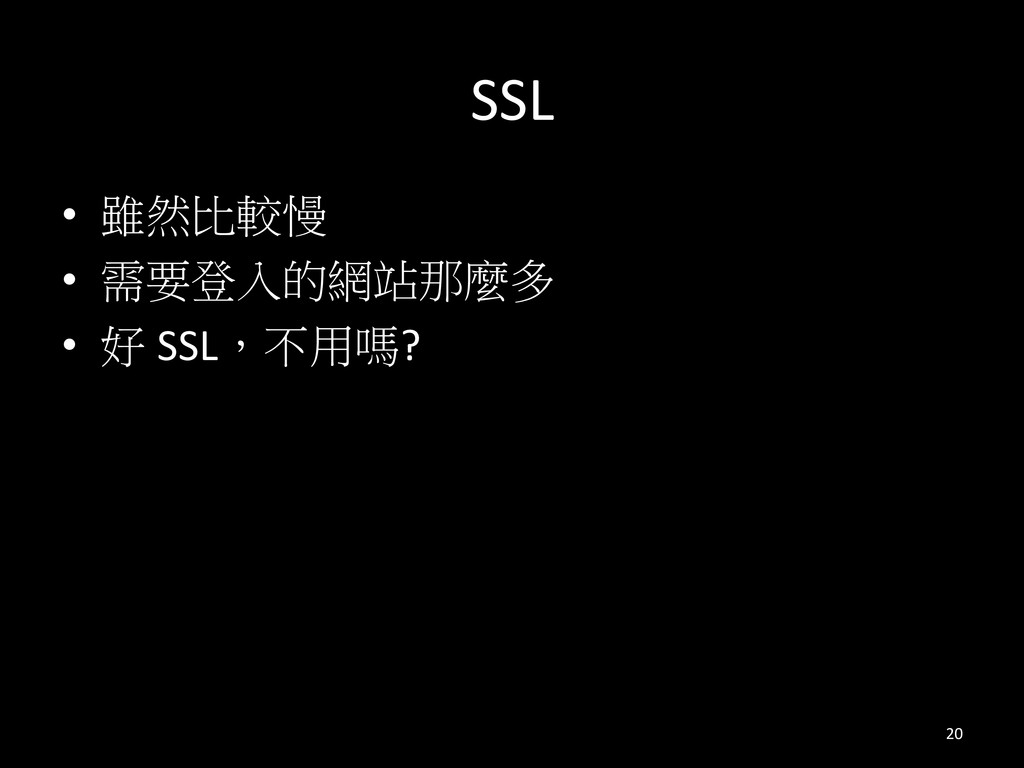 SSL • 雖然比較慢 • 需要登入的網站那麼多 • 好 SSL,不用嗎?