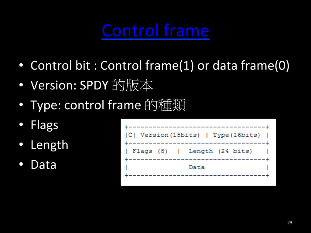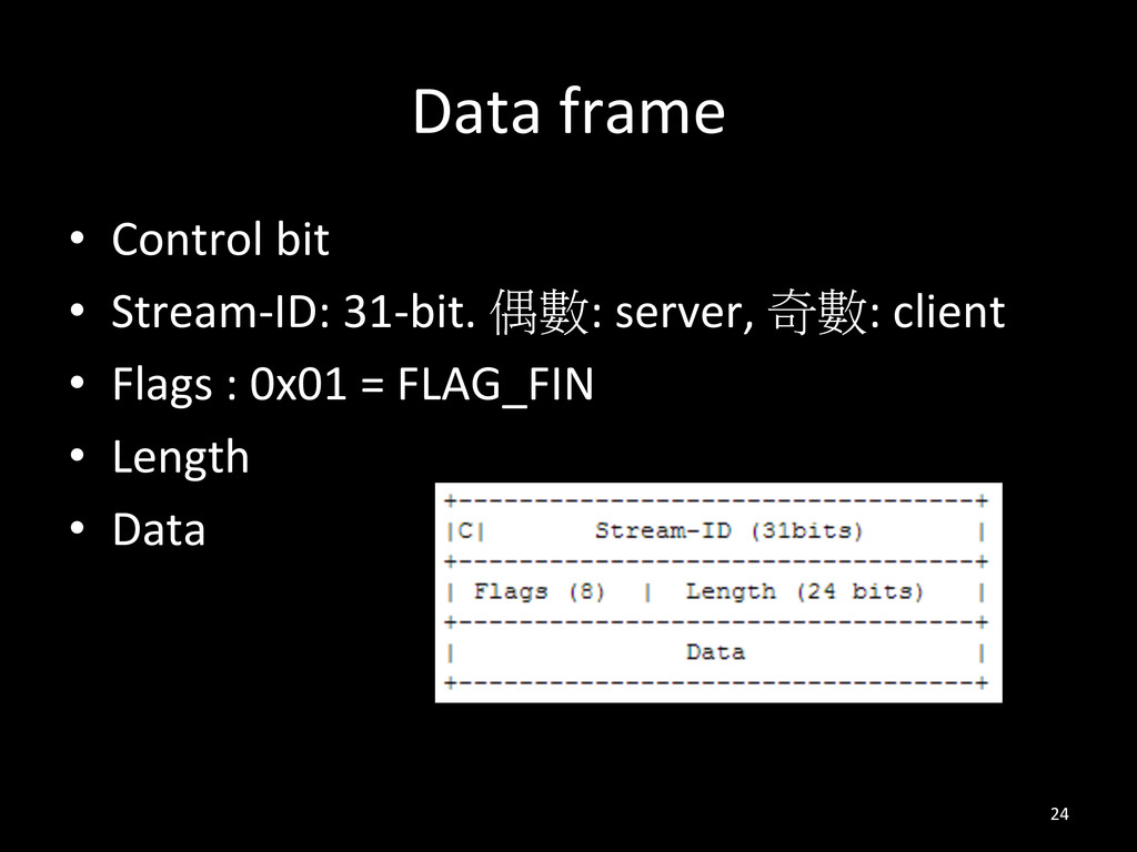frame(0) • Version: SPDY 的版本 • Type: control frame 的種類 • Flags • Length • Data 23