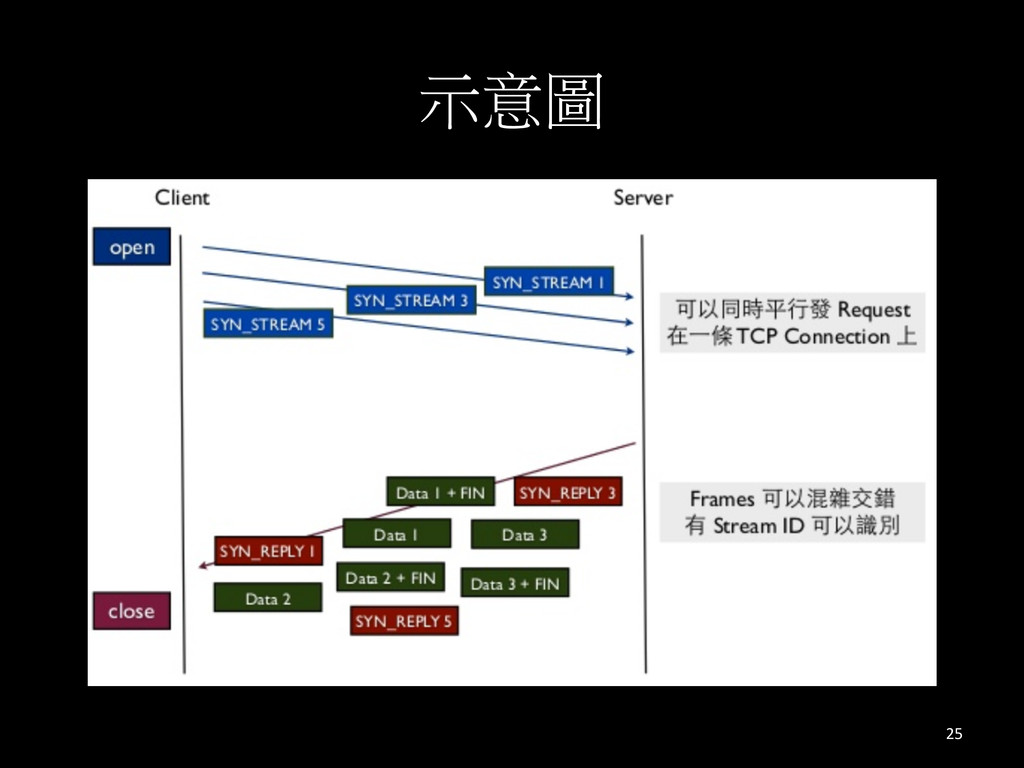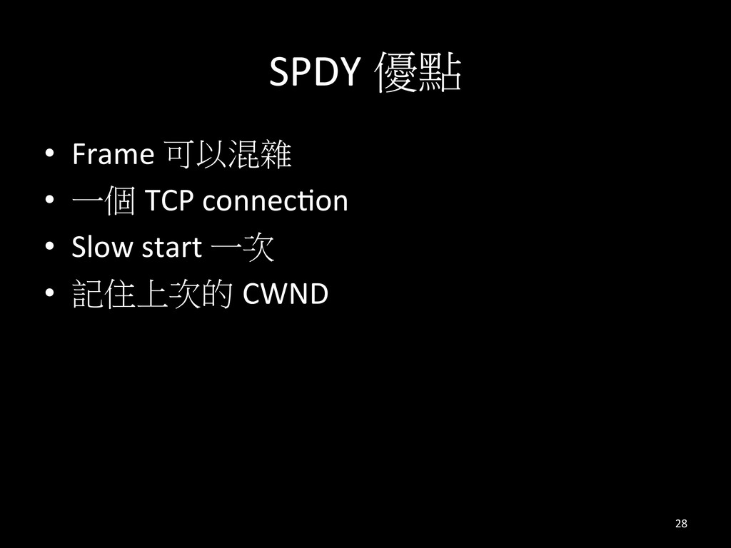 SPDY 優點 • Frame 可以混雜 • 一個 TCP connecLon
