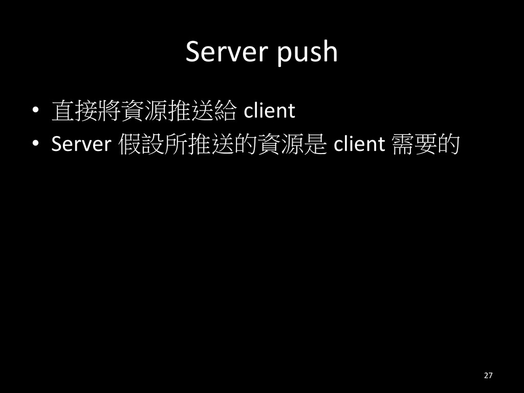 Server push • 直接將資源推送給 client • Server 假設所推送的資源是 client