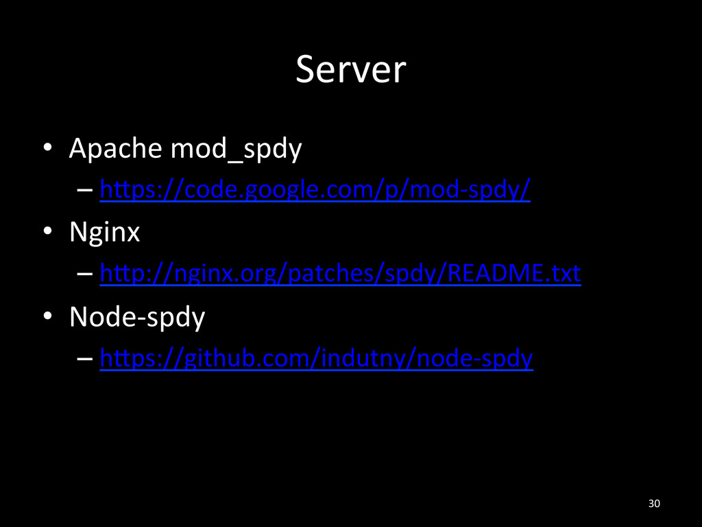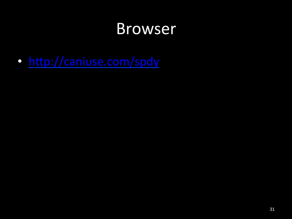 – h;p://nginx.org/patches/spdy/README.txt • Node-‐spdy – h;ps://github.com/indutny/node-‐spdy 30