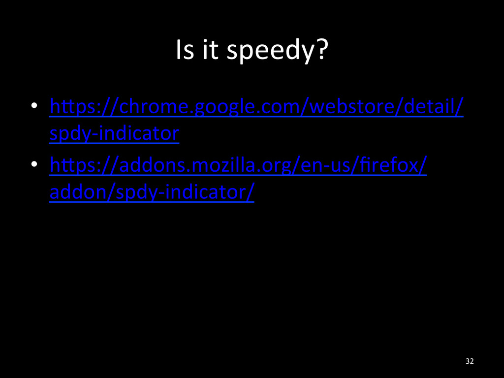 Is it speedy? • h;ps://chrome.google.com/webstore/detail/ spdy-‐indicator • h;ps://addons.mozilla.org/en-‐us/firefox/ addon/spdy-‐indicator/