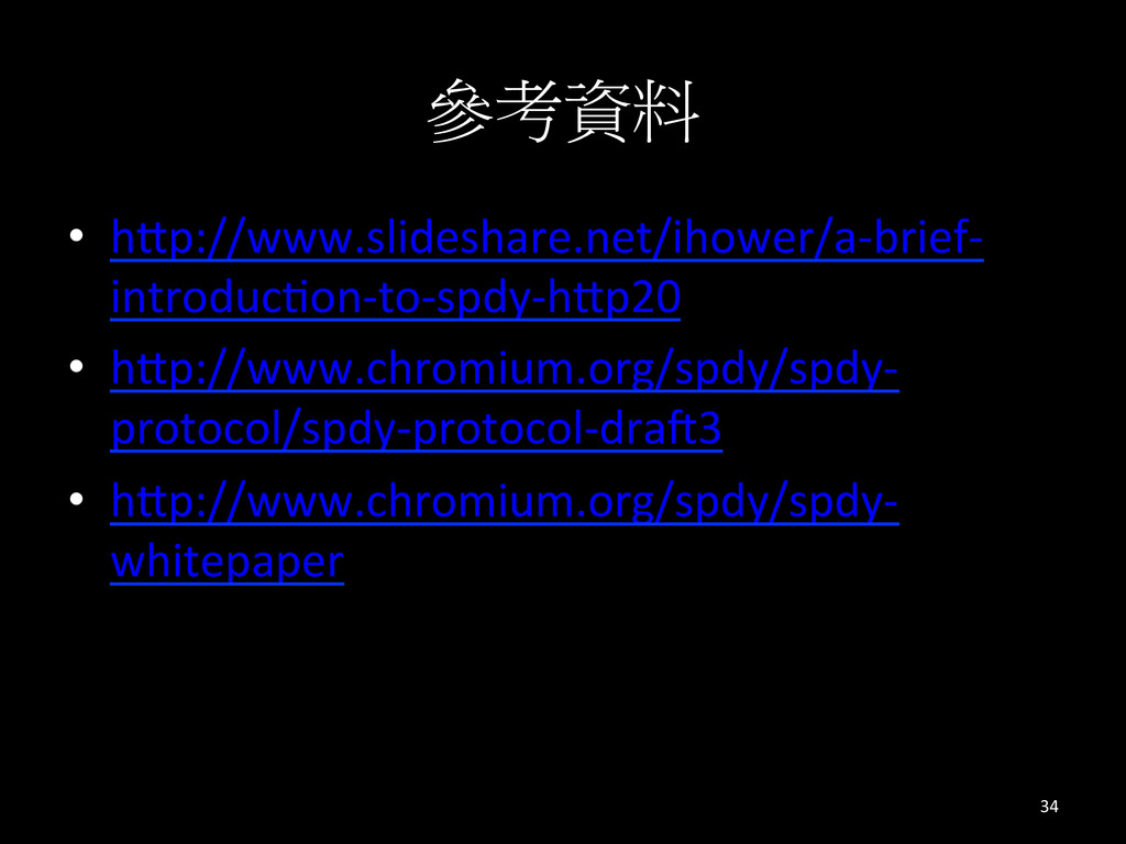參考資料 • h;p://www.slideshare.net/ihower/a-‐brief-‐ introducLon-‐to-‐spdy-‐h;p20 • h;p://www.chromium.org/spdy/spdy-‐ protocol/spdy-‐protocol-‐dram3 •