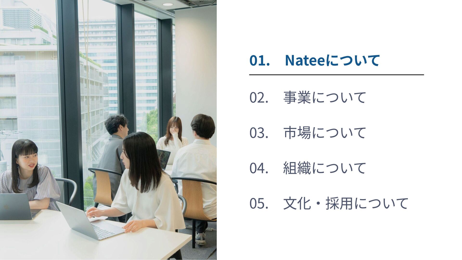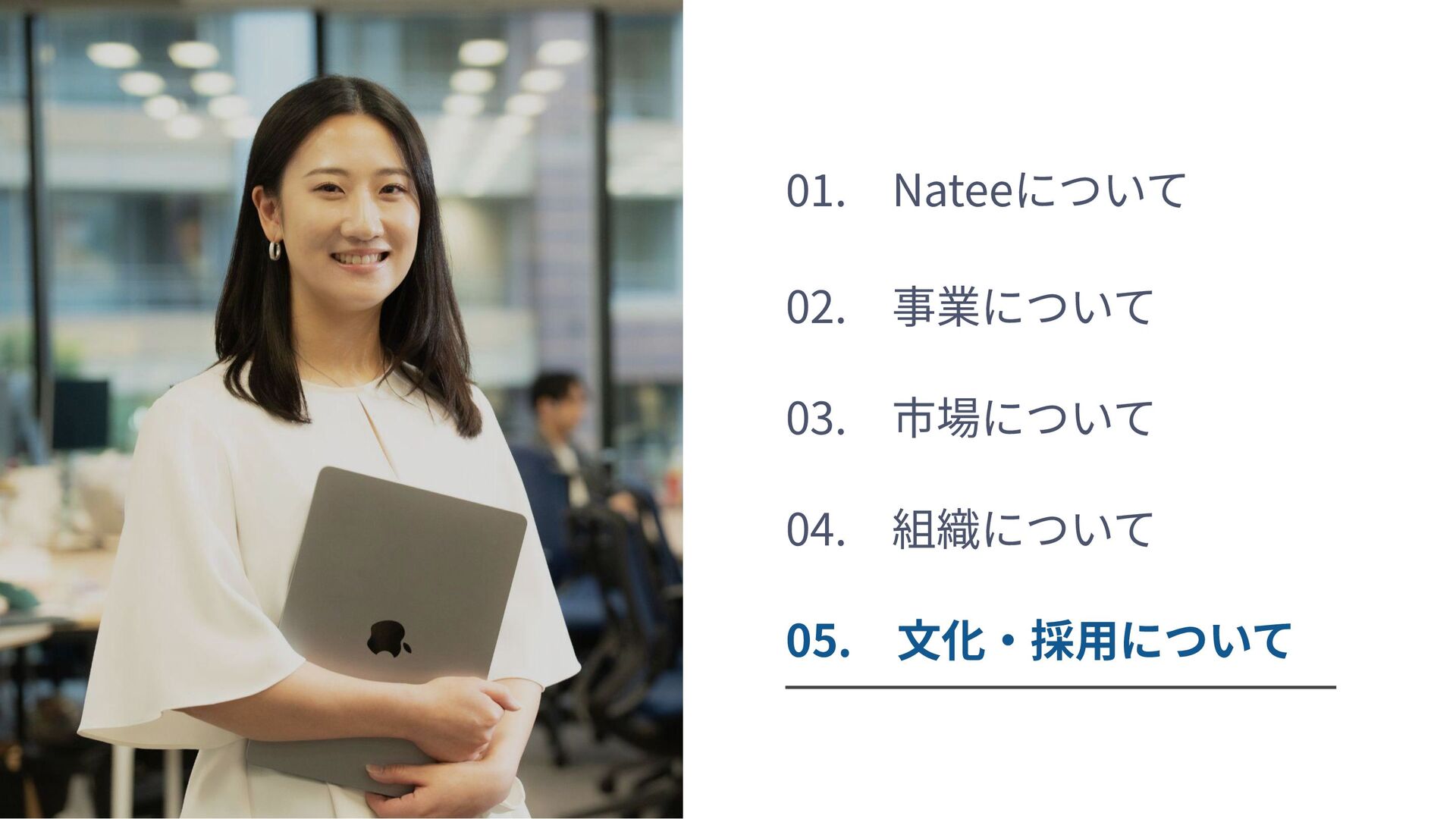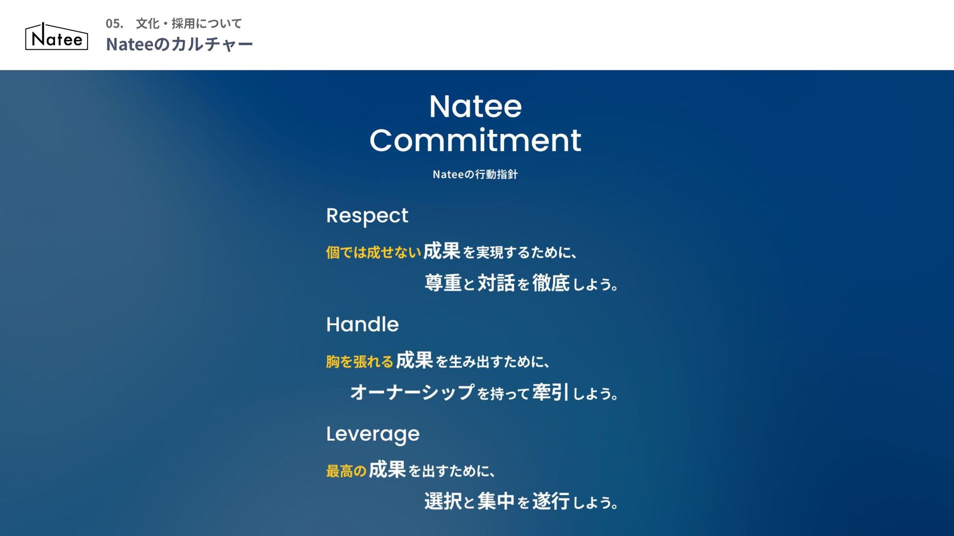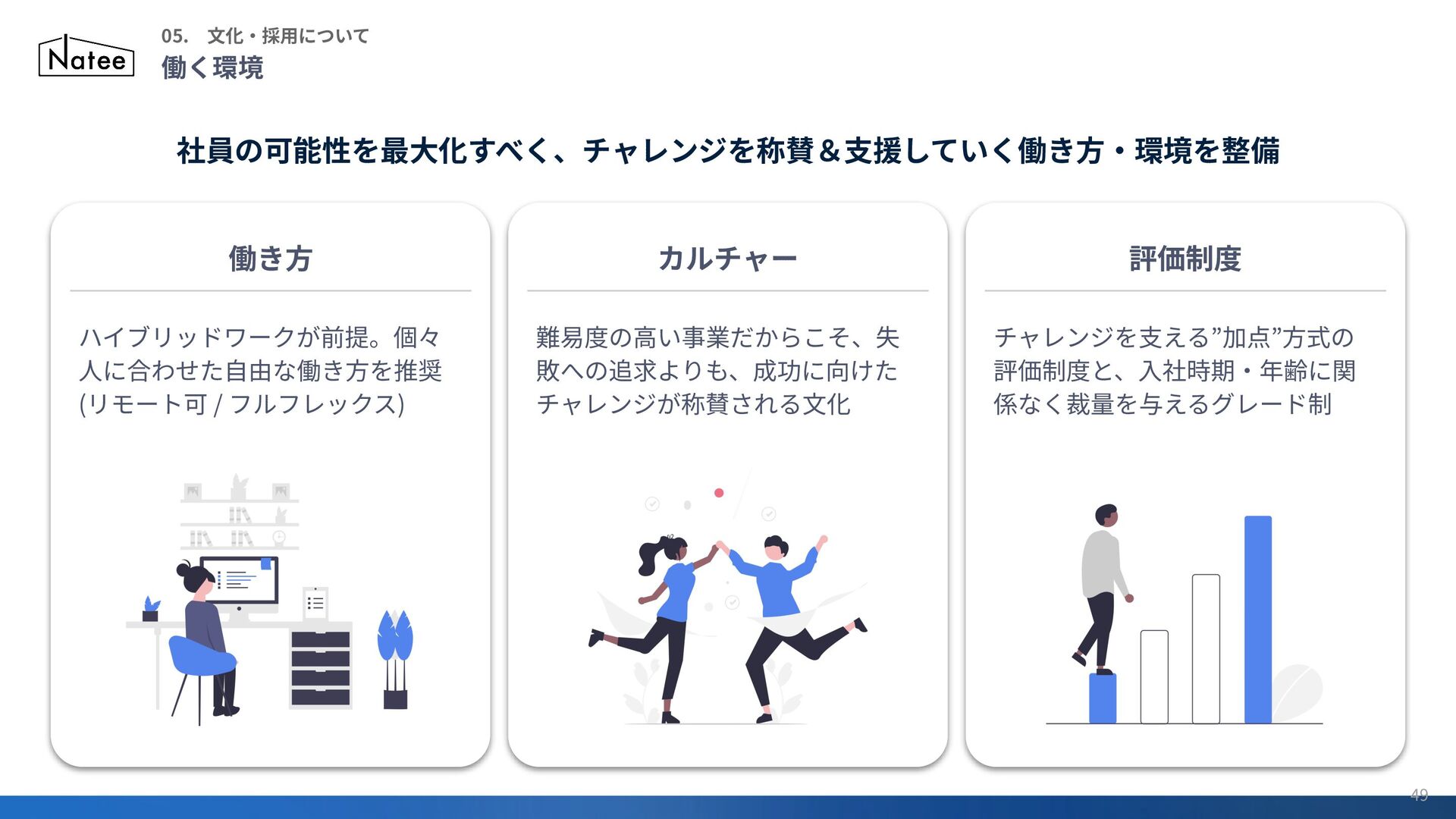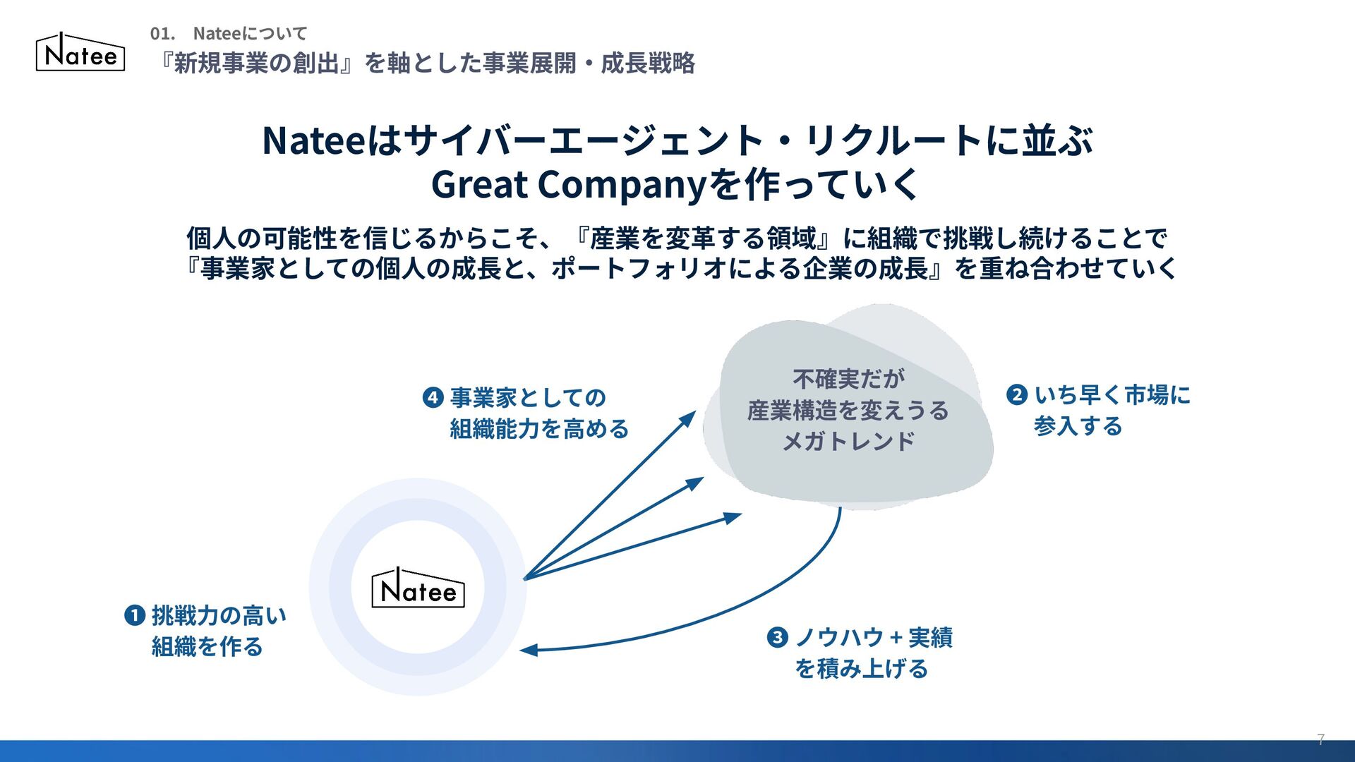 ❷ いち早く市場に   参⼊する ❸ ノウハウ + 実績   を積み上げる ❹ 事業家としての   組織能⼒を⾼める Nateeはサイバーエージェント‧リクルートに並ぶ Great Companyを作っていく 個⼈の可能性を信じるからこそ、『産業を変⾰する領域』に組織で挑戦し続けることで 『事業家としての個⼈の成⻑と、ポートフォリオによる企業の成⻑』を重ね合わせていく