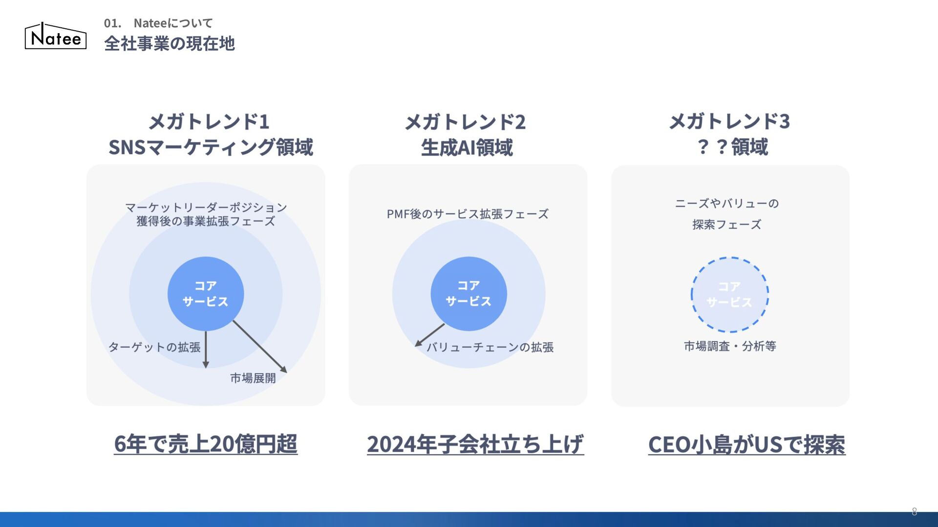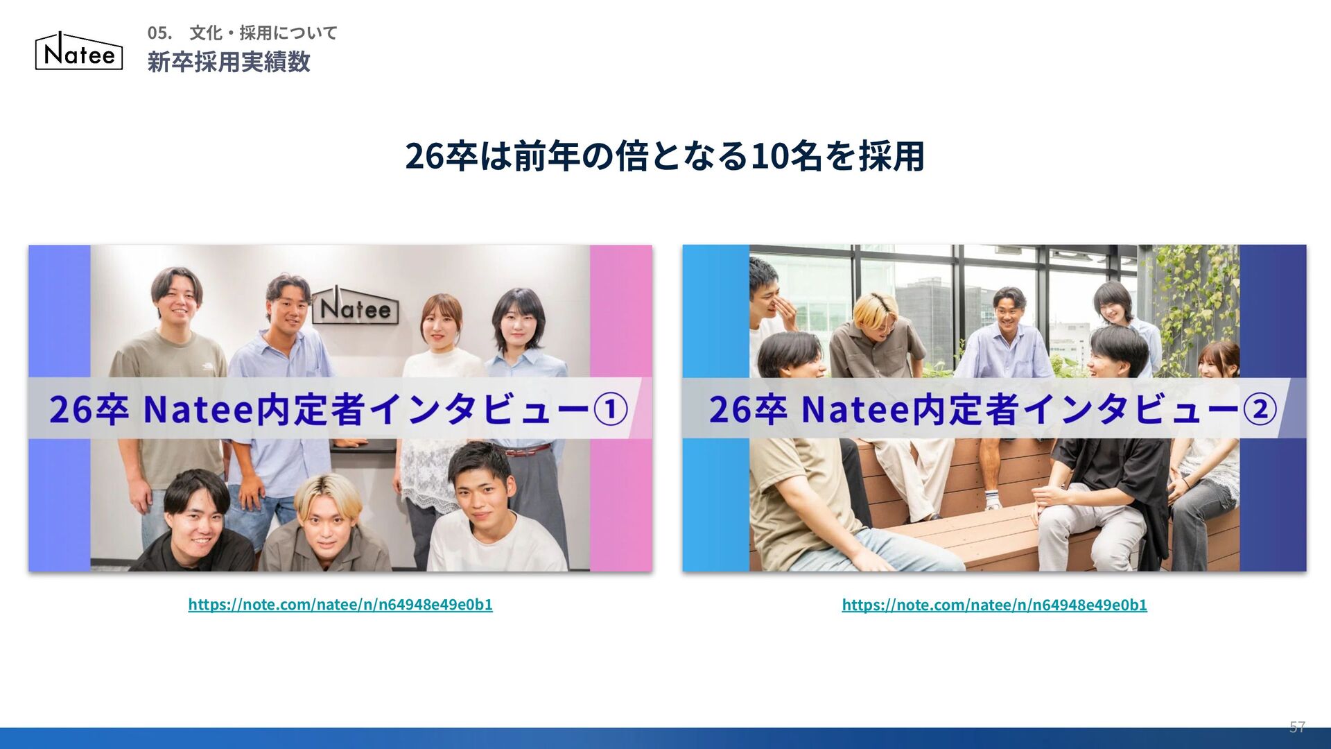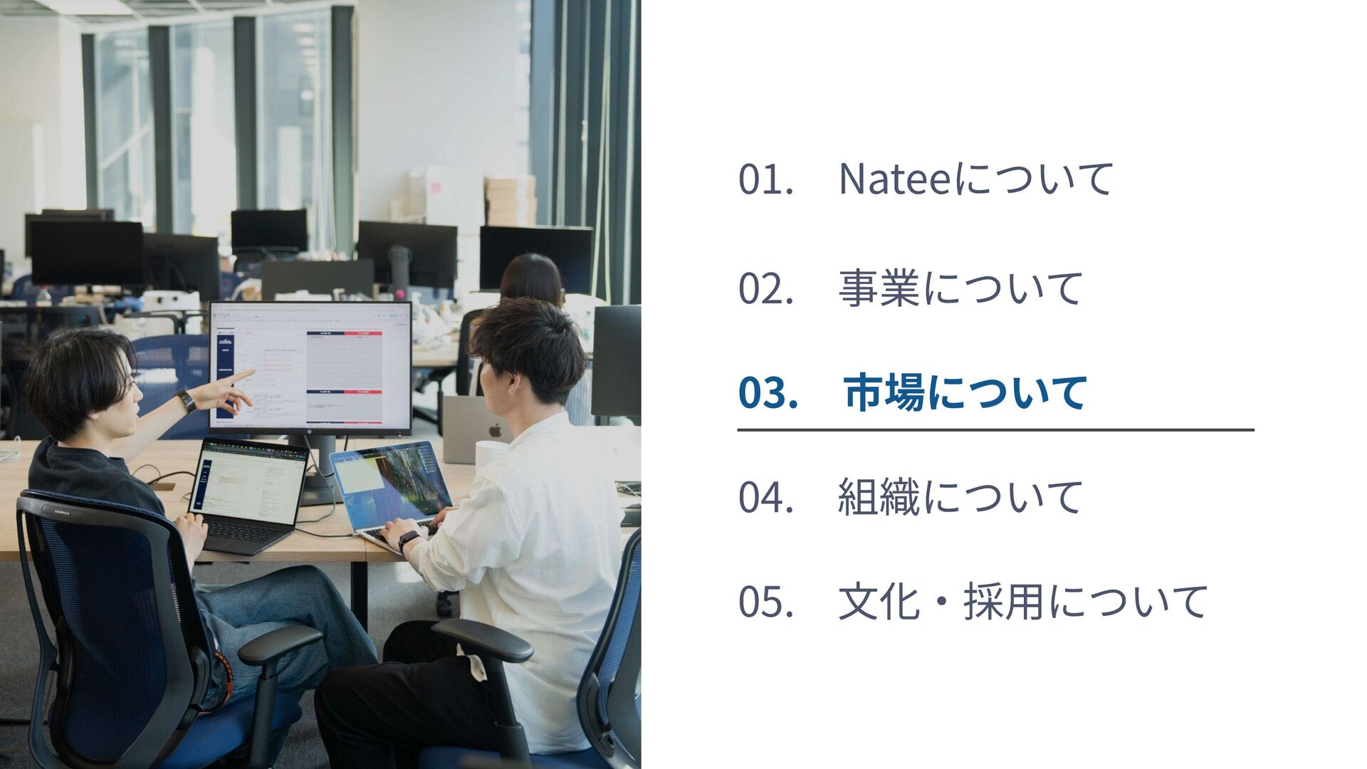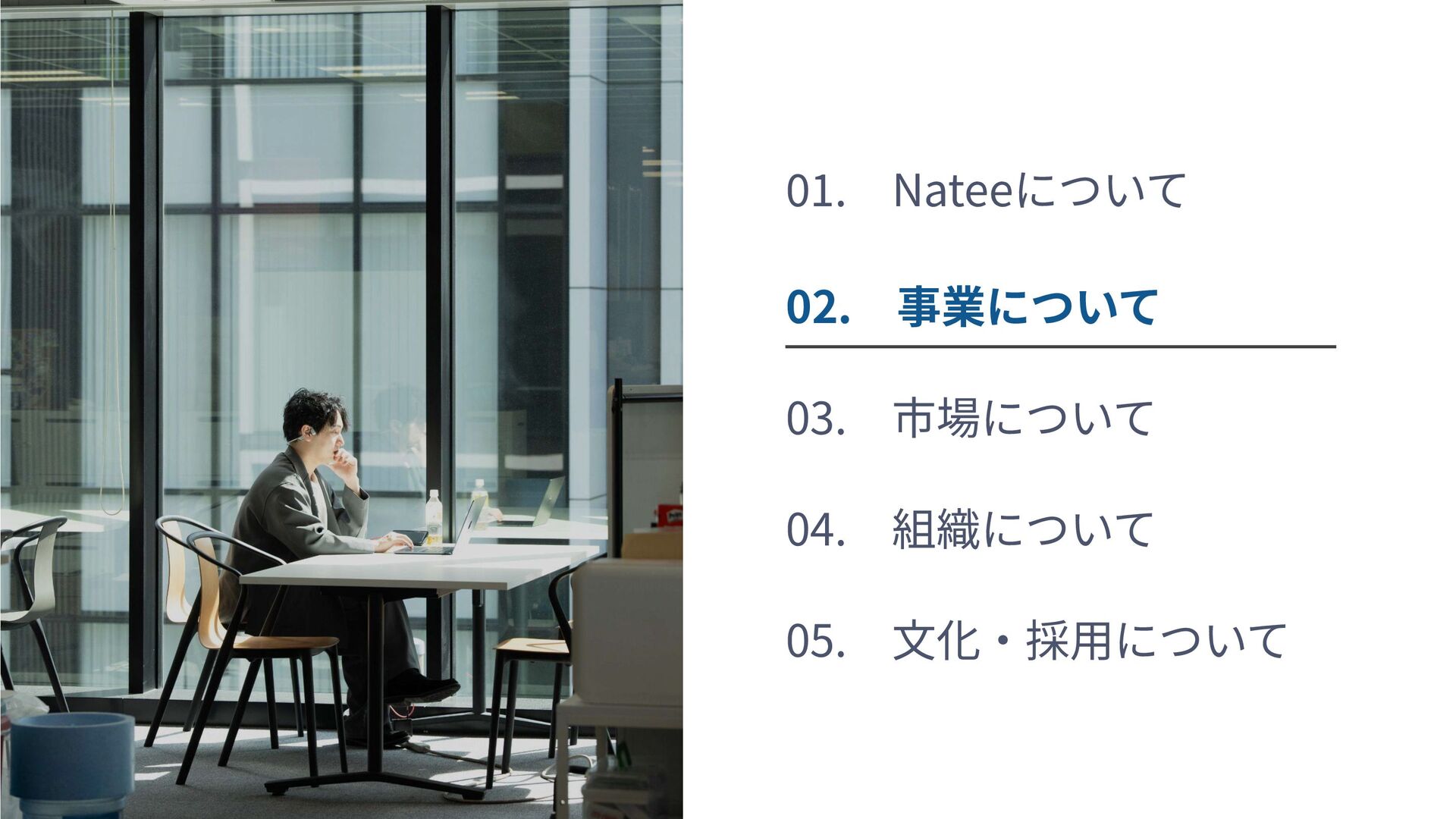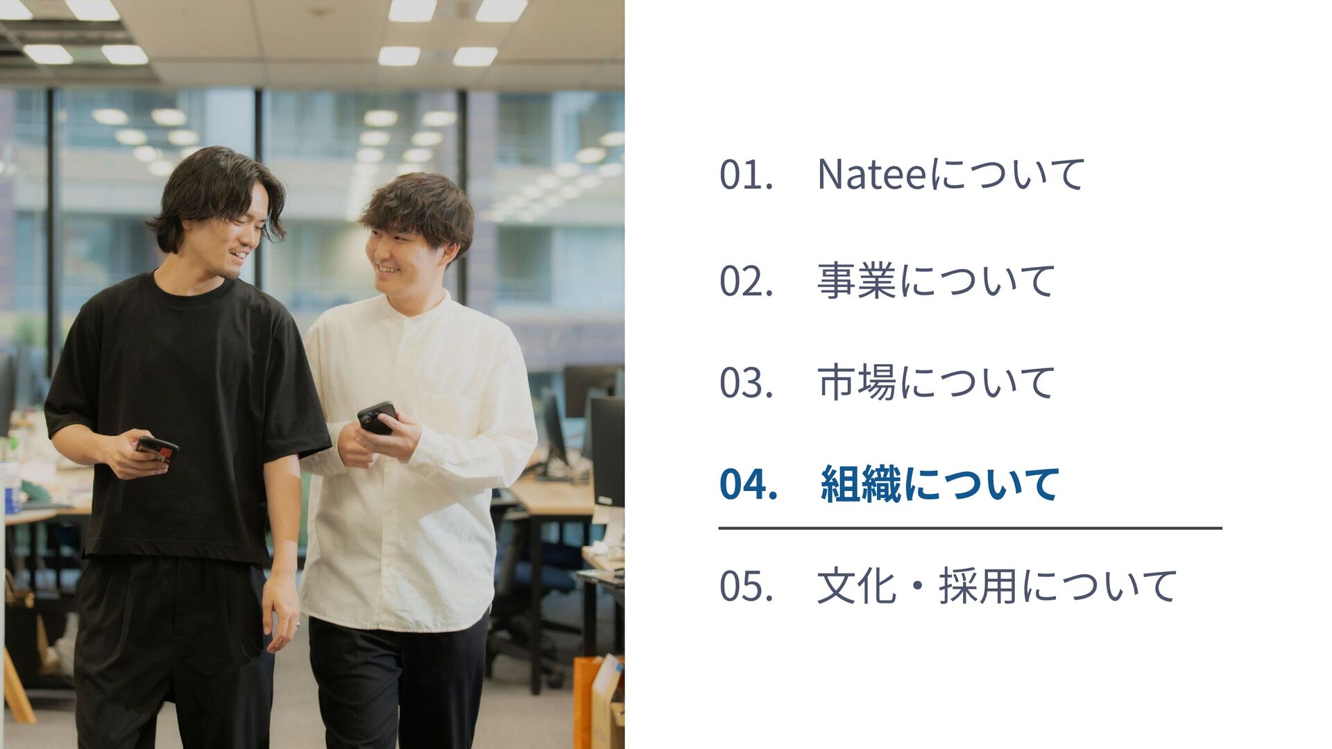 ❷ いち早く市場に   参⼊する ❸ ノウハウ + 実績   を積み上げる ❹ 事業家としての   組織能⼒を⾼める Nateeはサイバーエージェント‧リクルートに並ぶ Great Companyを作っていく 個⼈の可能性を信じるからこそ、『産業を変⾰する領域』に組織で挑戦し続けることで 『事業家としての個⼈の成⻑と、ポートフォリオによる企業の成⻑』を重ね合わせていく