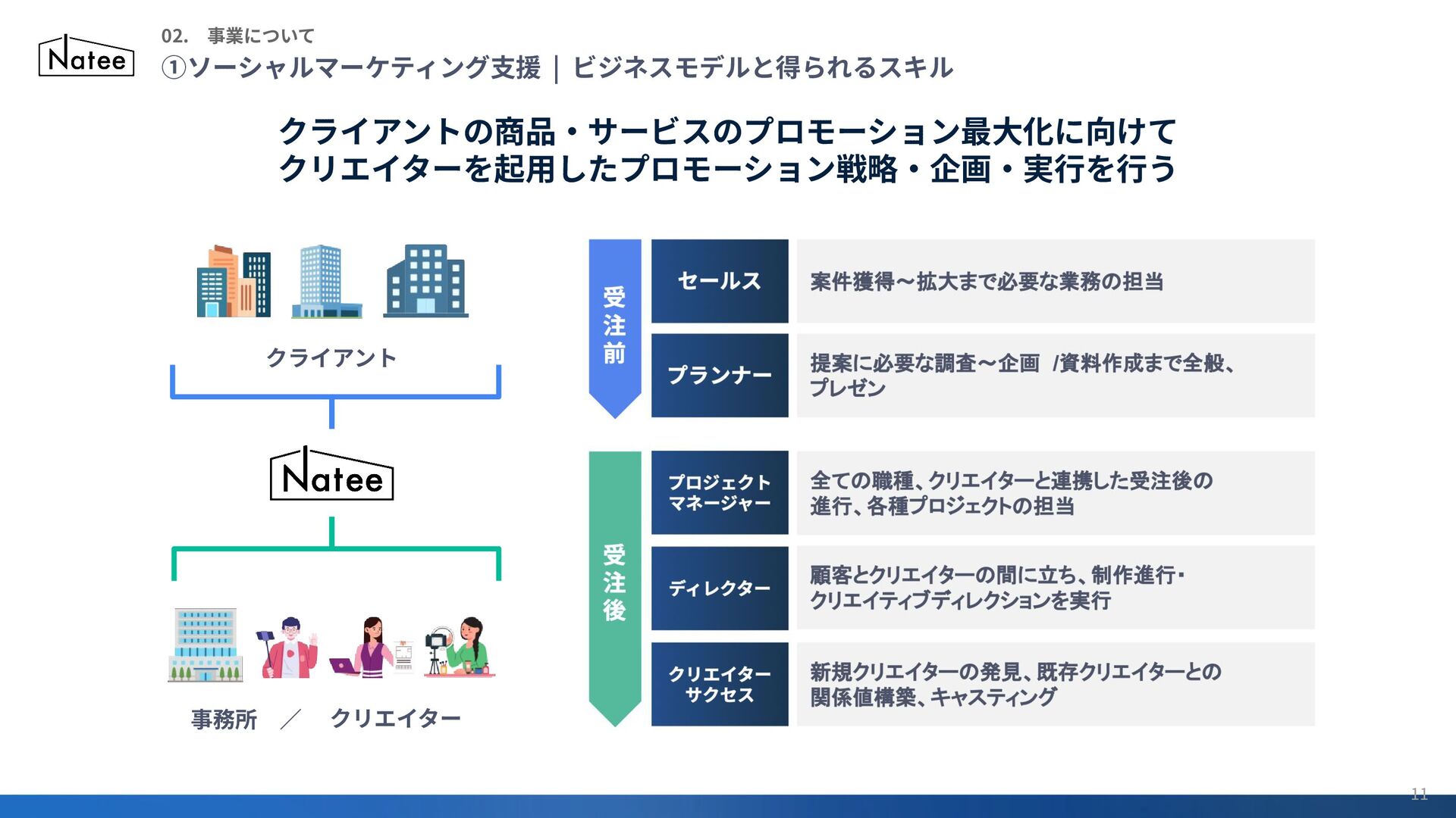 6. ⼤きく2つのビジネス領域で事業を展開 Nateeの事業領域 02. 事業について 10 ①ソーシャルマーケティング⽀援 ②新規事業開発 (クリエイター共創型ワークショップ& コンテンツソリューション) • ショートムービー制作過程をクリエイターと実際に体験できるワーク