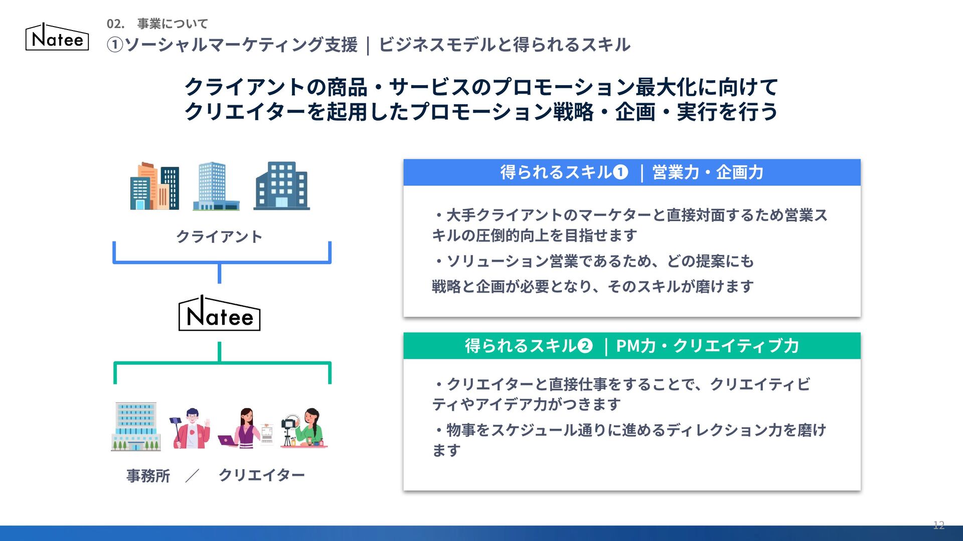 7. ①ソーシャルマーケティング⽀援 | ビジネスモデルと得られるスキル 02. 事業について 12 クライアントの商品‧サービスのプロモーション最⼤化に向けて クリエイターを起⽤したプロモーション戦略‧企画‧実⾏を⾏う 得られるスキル❶ | 営業⼒‧企画⼒