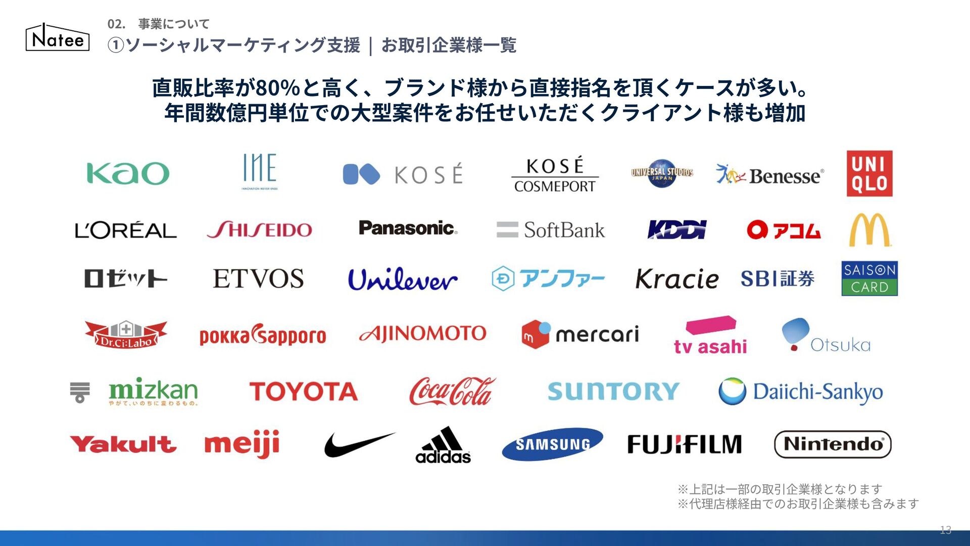キャスティング|クリエイティブ設計〜作成 制作進⾏‧ディレクション|分析‧レポート 外 資 コ ン サ ル ⼤ ⼿ 代 理 店 SNS 専業 Natee 創業当初よりソーシャルトレンドに強い‧かつ戦略の⽀援から伴⾛してきた Nateeに案件が集まる状況に