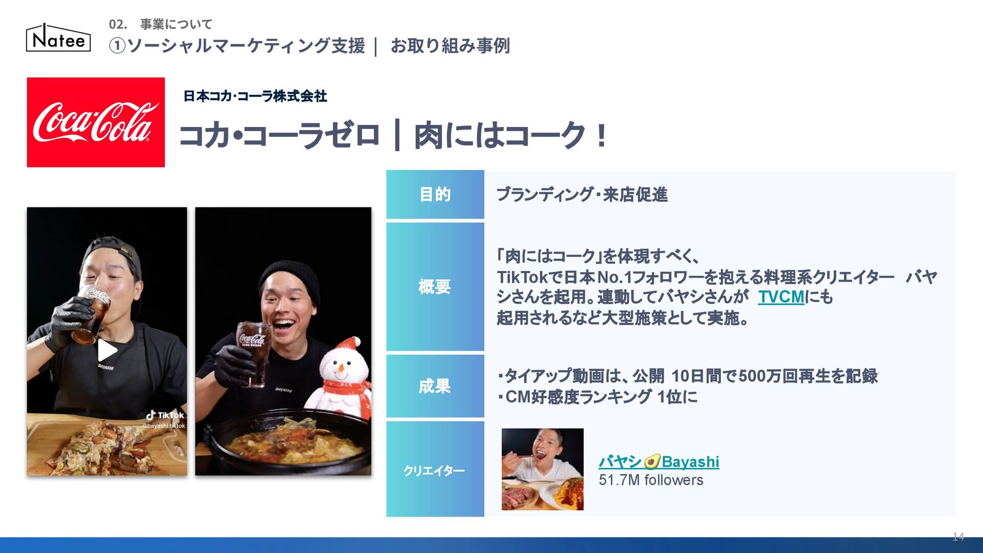 8. ①ソーシャルマーケティング⽀援 | お取り組み事例 02. 事業について 14 日本コカ・コーラ株式会社 コカ•コーラゼロ|肉にはコーク! ブランディング・来店促進 「肉にはコーク」を体現すべく、 TikTokで日本No.1フォロワーを抱える料理系クリエイター バヤ