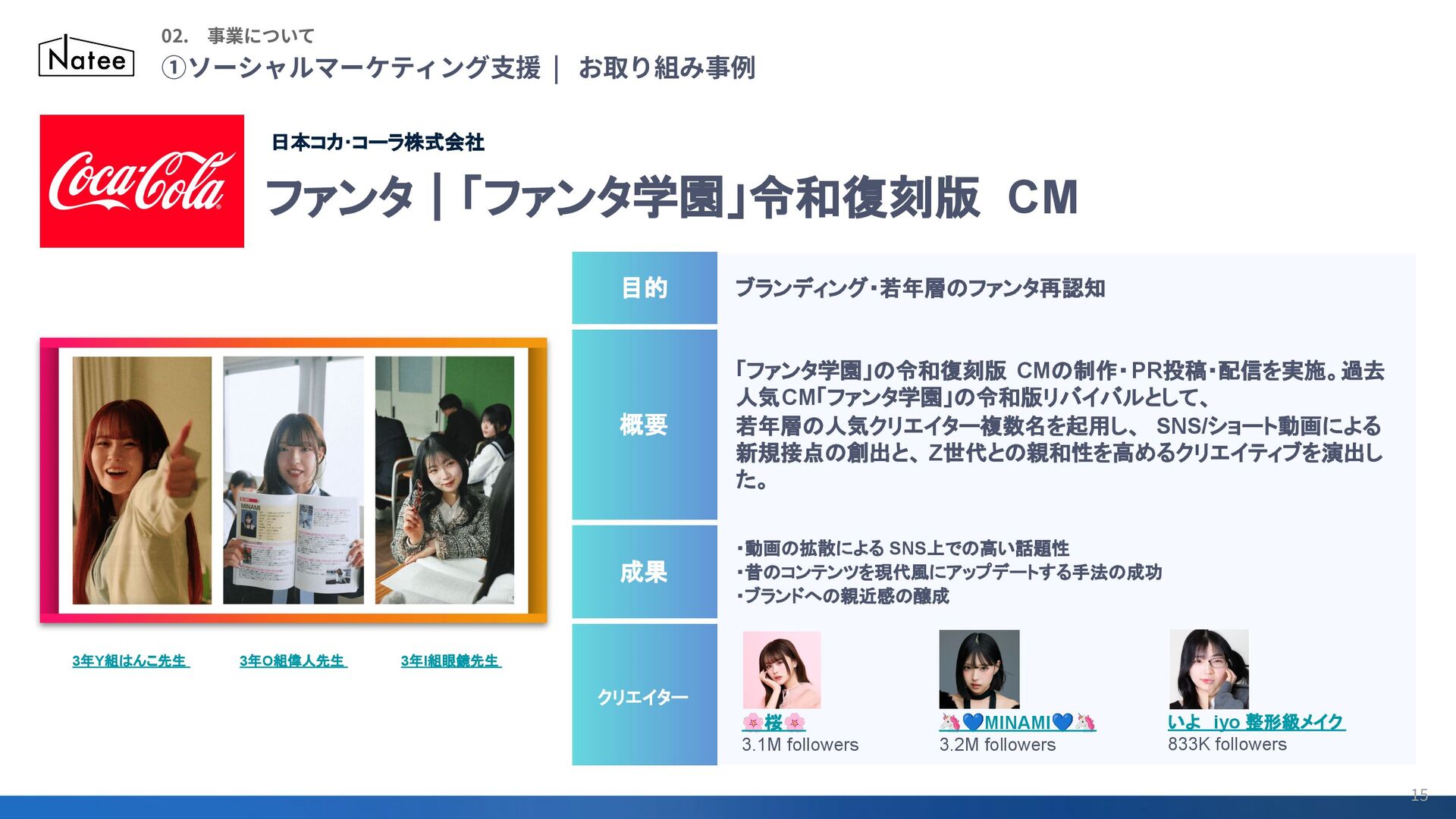 9. 02. 事業について 15 ①ソーシャルマーケティング⽀援 | お取り組み事例 ブランディング・若年層のファンタ再認知 「ファンタ学園」の令和復刻版 CMの制作・PR投稿・配信を実施。過去 人気CM「ファンタ学園」の令和版リバイバルとして、 若年層の人気クリエイター複数名を起用し、
