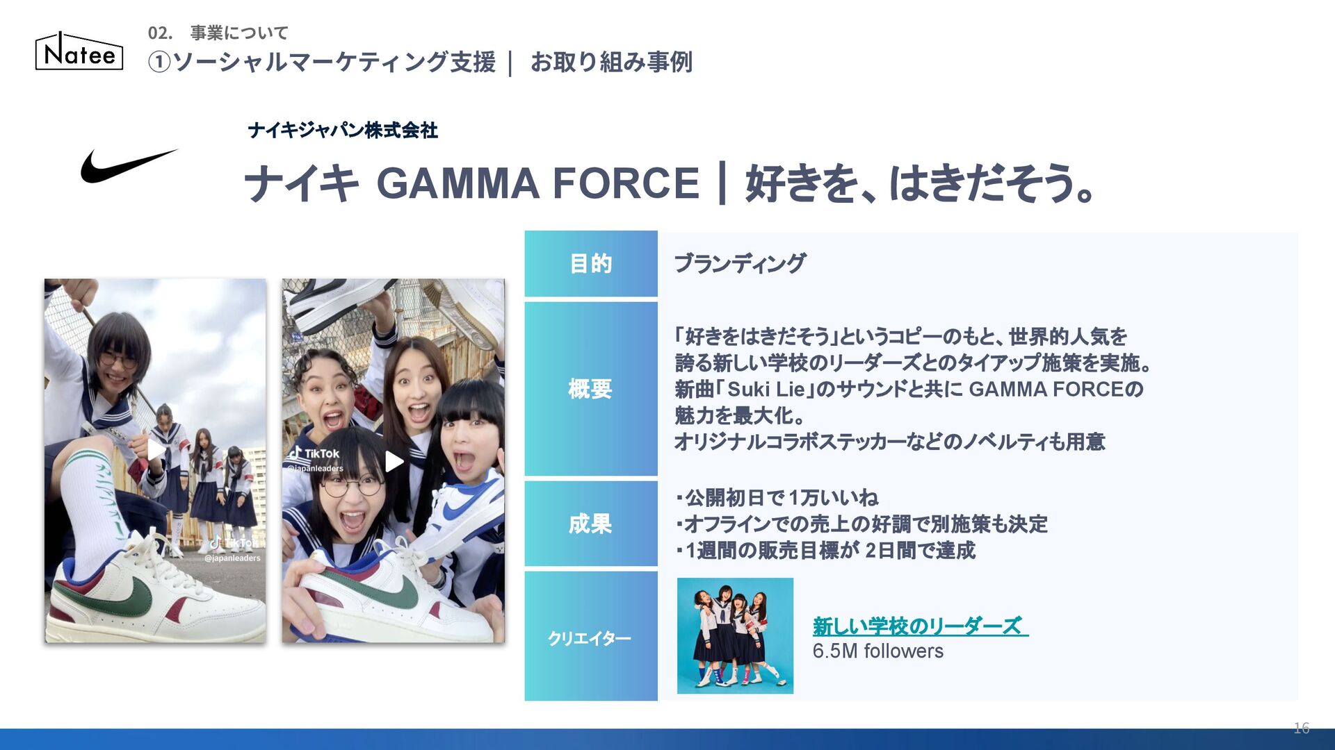 誇る新しい学校のリーダーズとのタイアップ施策を実施。 新曲「Suki Lie」のサウンドと共に GAMMA FORCEの 魅力を最大化。 オリジナルコラボステッカーなどのノベルティも用意 ・公開初日で 1万いいね ・オフラインでの売上の好調で別施策も決定 ・1週間の販売目標が 2日間で達成 目的 概要 成果 クリエイター ナイキジャパン株式会社 ナイキ GAMMA FORCE|好きを、はきだそう。