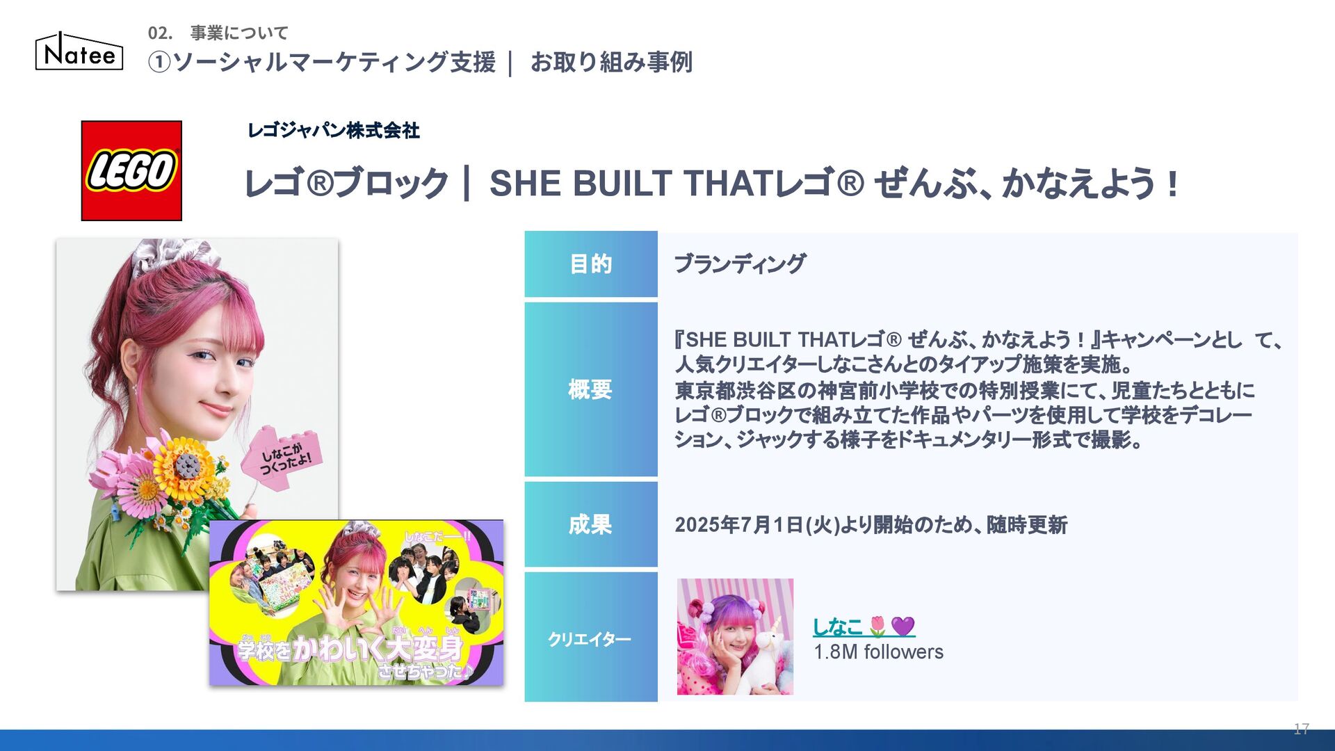 11. 02. 事業について 17 しなこ🌷💜 1.8M followers ①ソーシャルマーケティング⽀援 | お取り組み事例 ブランディング 『SHE