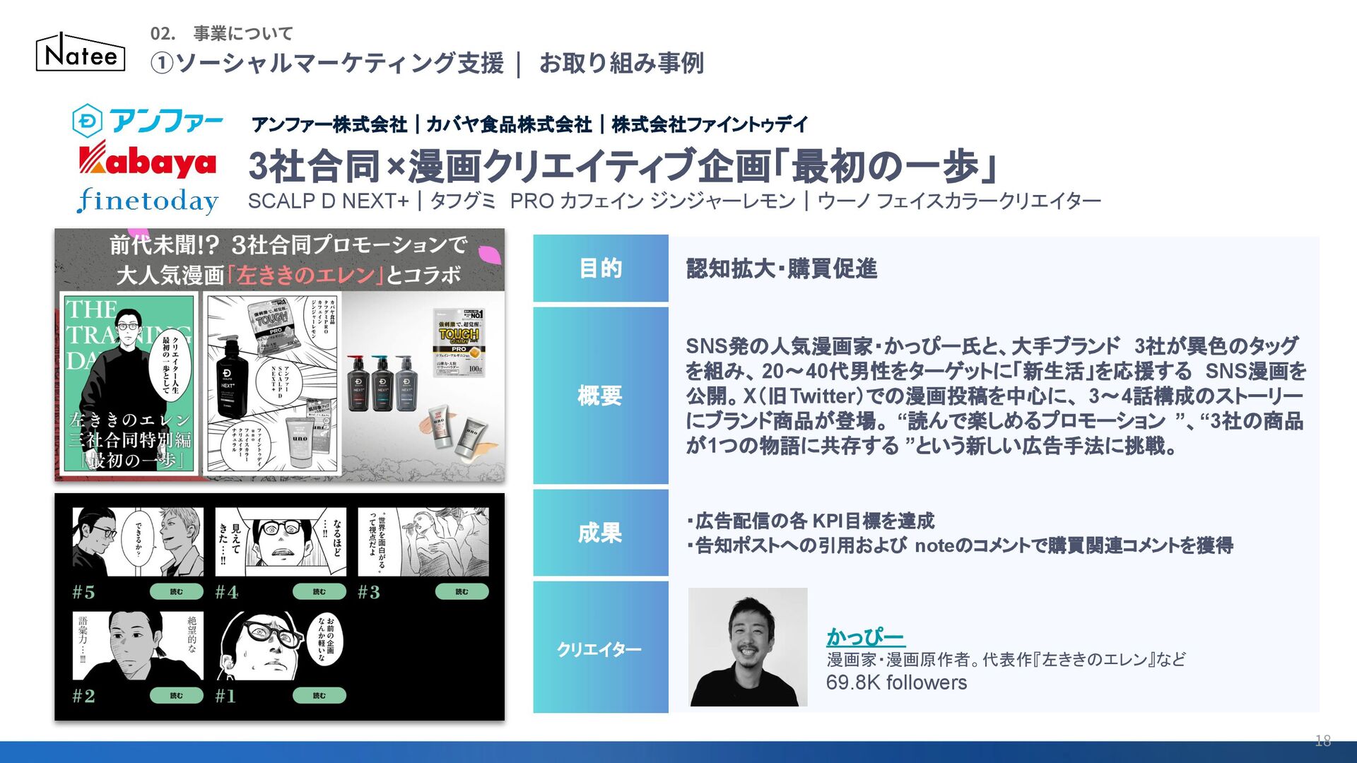 12. 02. 事業について 18 かっぴー 漫画家・漫画原作者。代表作『左ききのエレン』など 69.8K followers ①ソーシャルマーケティング⽀援 | お取り組み事例 認知拡大・購買促進