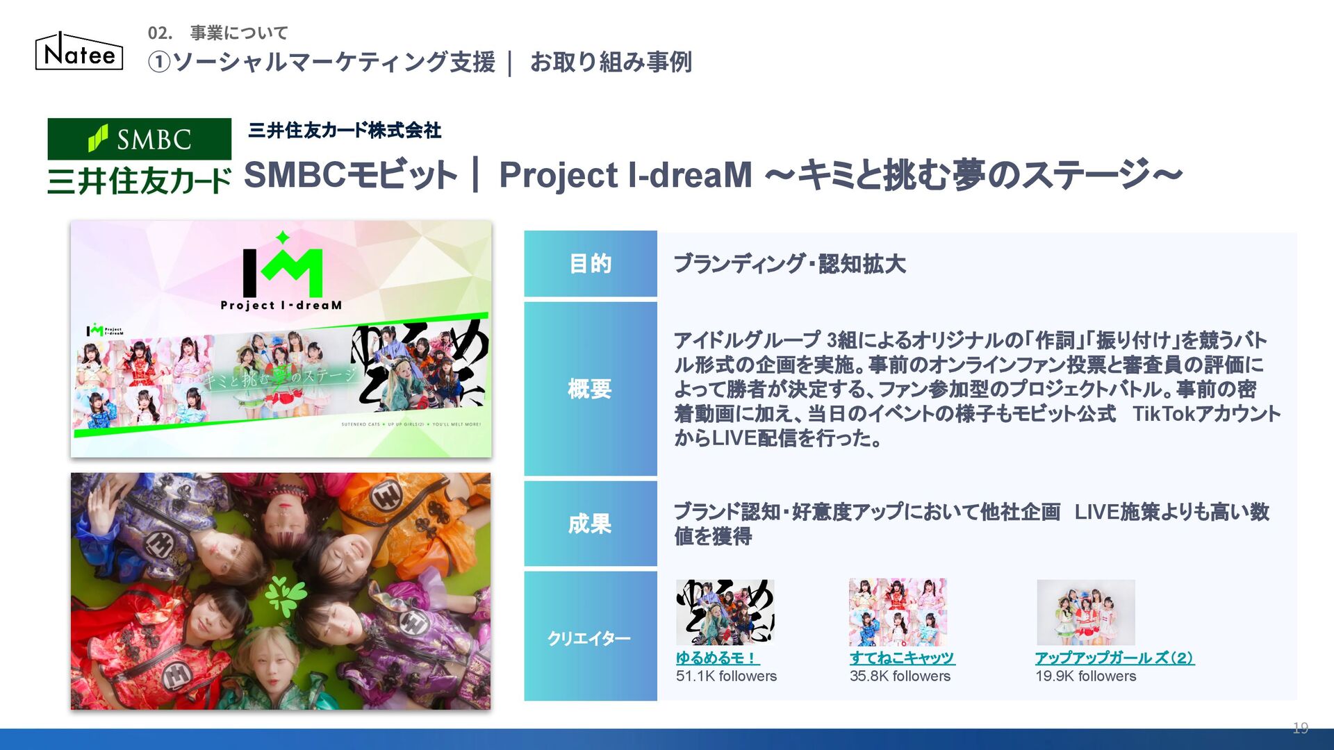 着動画に加え、当日のイベントの様子もモビット公式 TikTokアカウント からLIVE配信を行った。 ブランド認知・好意度アップにおいて他社企画 LIVE施策よりも高い数 値を獲得 目的 概要 成果 クリエイター 三井住友カード株式会社 SMBCモビット| Project I-dreaM ~キミと挑む夢のステージ~ ゆるめるモ! 51.1K followers すてねこキャッツ 35.8K followers アップアップガール ズ(2) 19.9K followers