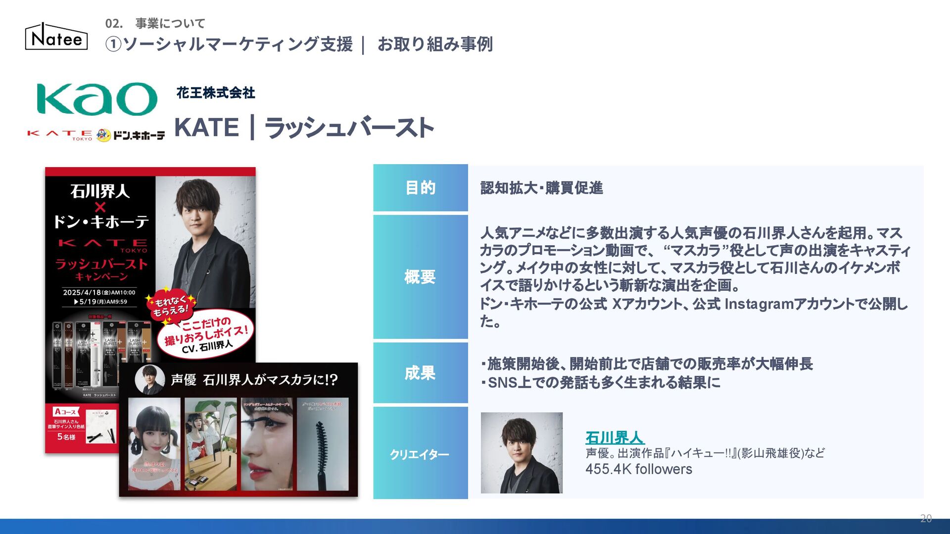 イスで語りかけるという斬新な演出を企画。 ドン・キホーテの公式 Xアカウント、公式 Instagramアカウントで公開し た。 ・施策開始後、開始前比で店舗での販売率が大幅伸長 ・SNS上での発話も多く生まれる結果に 目的 概要 成果 クリエイター 花王株式会社 KATE|ラッシュバースト 石川界人 声優。出演作品『ハイキュー!!』(影山飛雄役)など 455.4K followers