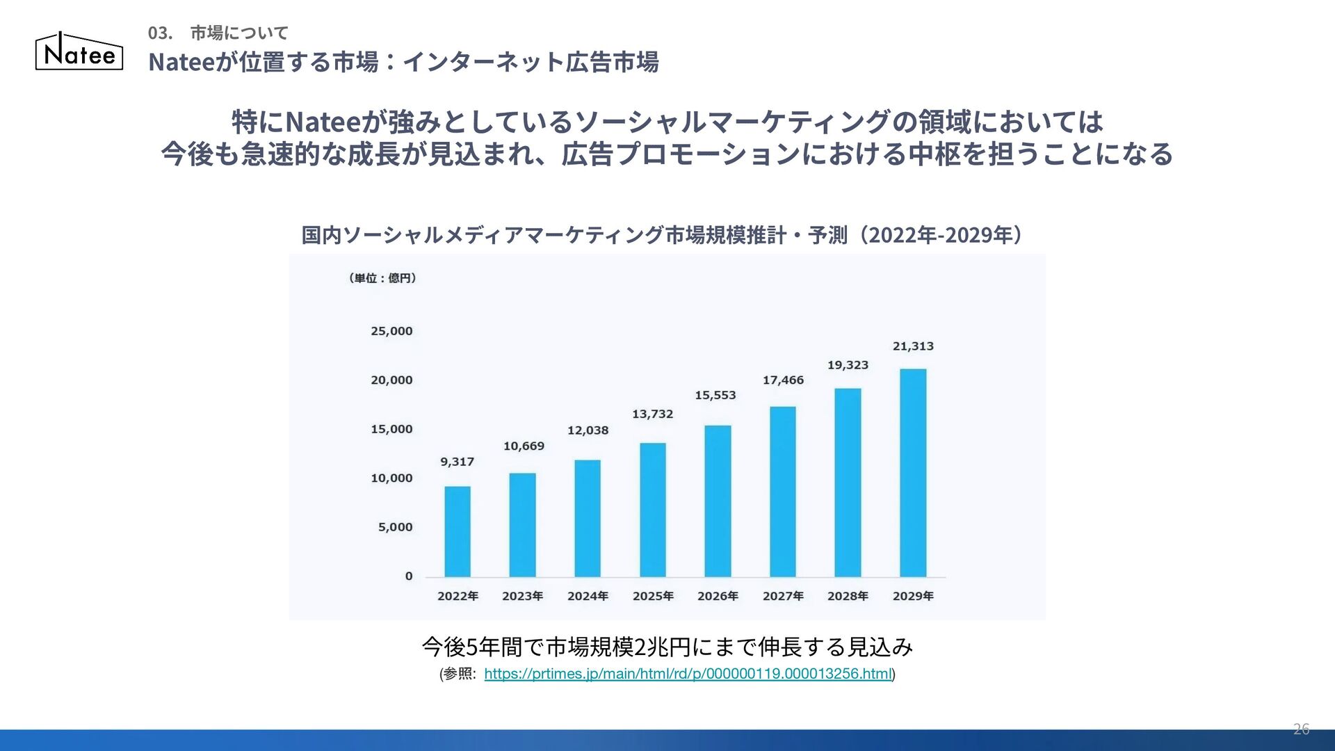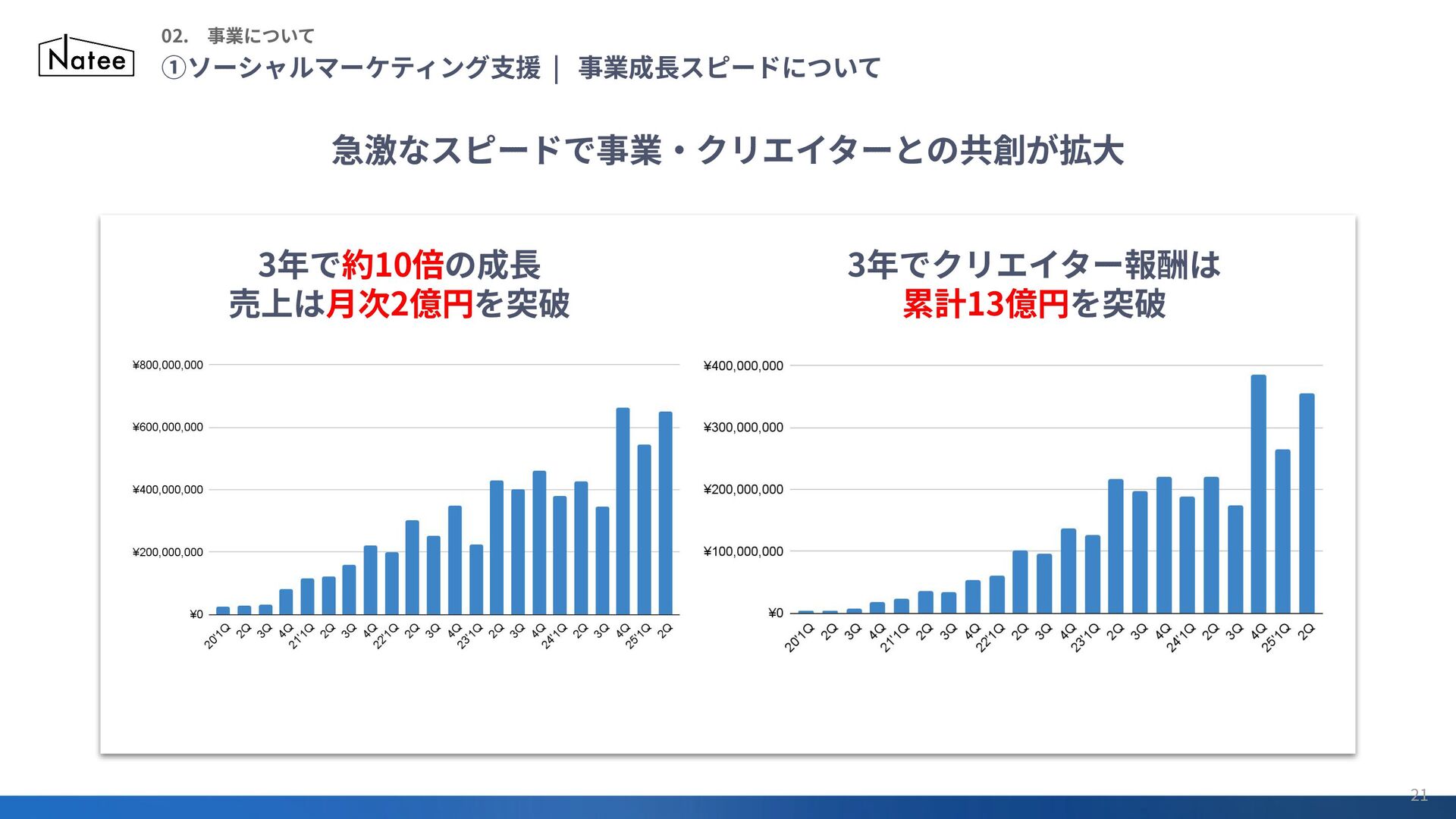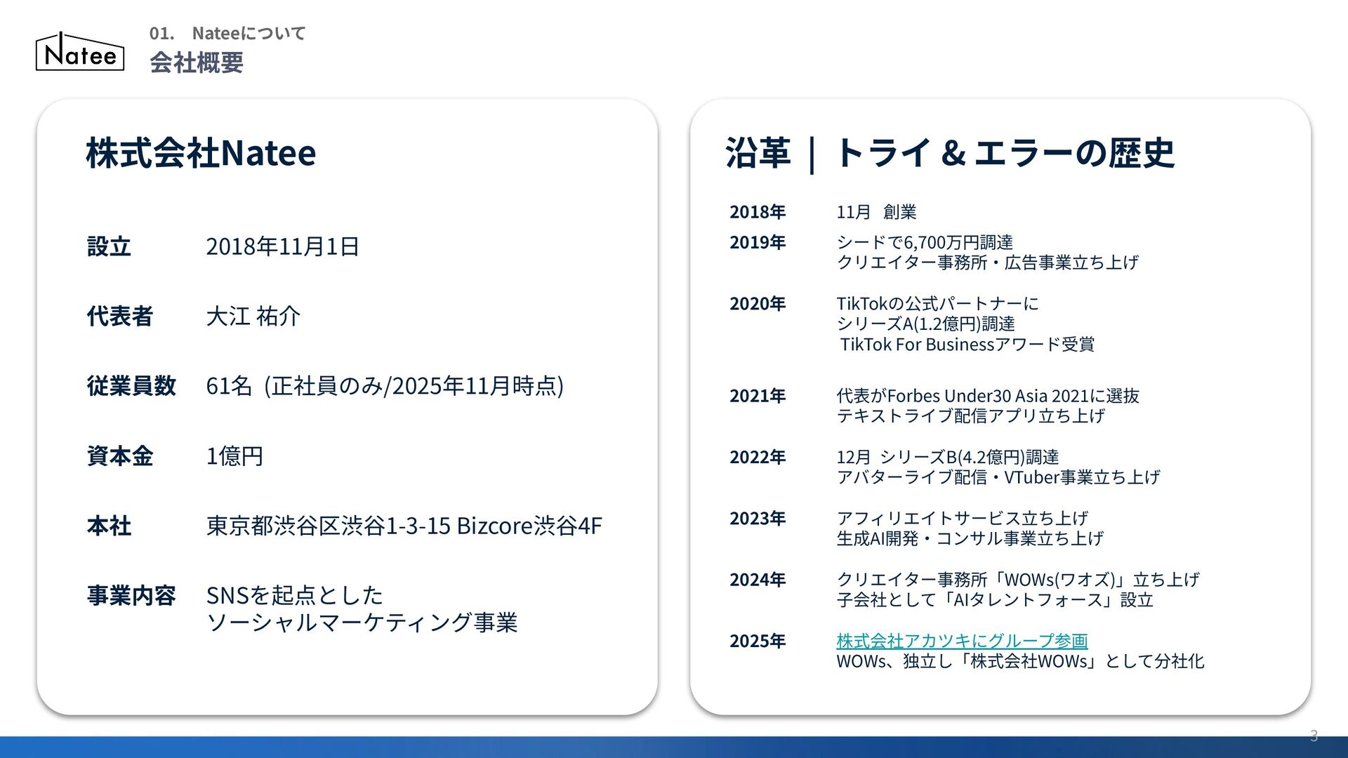 代表者 ⼤江 祐介 従業員数 61名 (正社員のみ/2025年11⽉時点) 資本⾦ 1億円 本社 東京都渋⾕区渋⾕1-3-15 Bizcore渋⾕4F 事業内容 SNSを起点とした ソーシャルマーケティング事業 2018年 11⽉ 創業 2019年 シードで6,700万円調達 クリエイター事務所‧広告事業⽴ち上げ 2020年 TikTokの公式パートナーに シリーズA(1.2億円)調達 TikTok For Businessアワード受賞 2021年 代表がForbes Under30 Asia 2021に選抜 テキストライブ配信アプリ⽴ち上げ 2022年 12⽉ シリーズB(4.2億円)調達 アバターライブ配信‧VTuber事業⽴ち上げ 2023年 アフィリエイトサービス⽴ち上げ ⽣成AI開発‧コンサル事業⽴ち上げ 2024年 クリエイター事務所「WOWs(ワオズ)」⽴ち上げ ⼦会社として「AIタレントフォース」設⽴ 2025年 株式会社アカツキにグループ参画 WOWs、独⽴し「株式会社WOWs」として分社化 01. Nateeについて