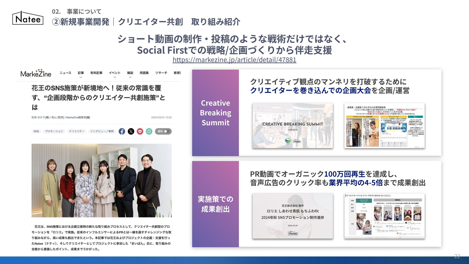 15. ②新規事業開発|クリエイター共創 取り組み紹介 02. 事業について 22 ショート動画の制作‧投稿のような戦術だけではなく、 Social Firstでの戦略/企画づくりから伴⾛⽀援 https://markezine.jp/article/detail/47881 Creative Breaking Summit