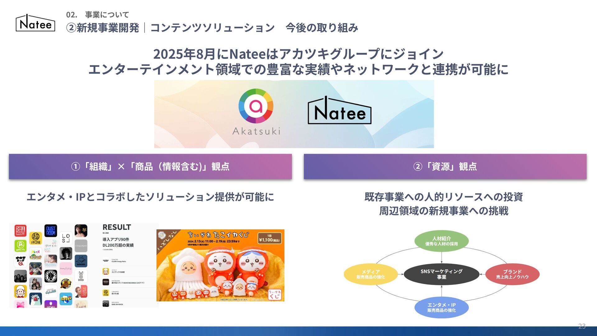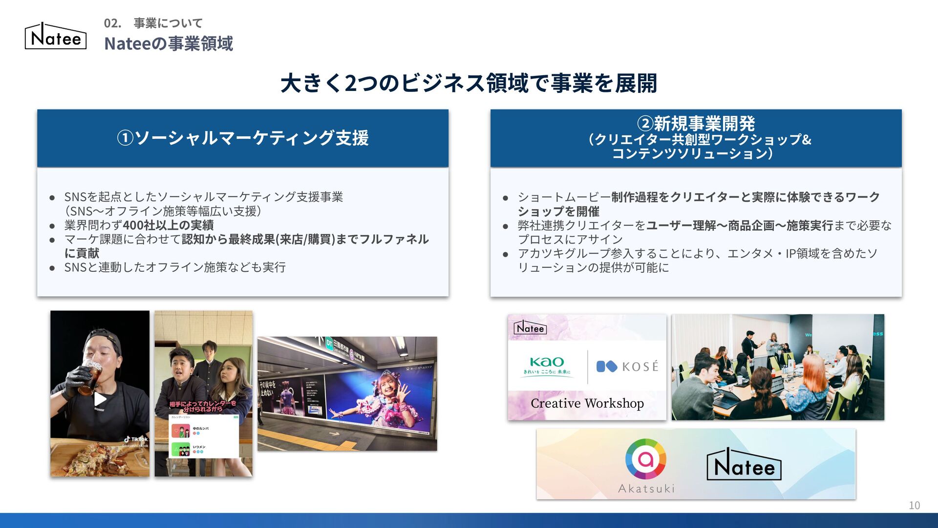 ショップを開催 • 弊社連携クリエイターをユーザー理解〜商品企画〜施策実⾏まで必要な プロセスにアサイン • アカツキグループ参⼊することにより、エンタメ‧IP領域を含めたソ リューションの提供が可能に • SNSを起点としたソーシャルマーケティング⽀援事業  (SNS〜オフライン施策等幅広い⽀援) • 業界問わず400社以上の実績 • マーケ課題に合わせて認知から最終成果(来店/購買)までフルファネル に貢献 • SNSと連動したオフライン施策なども実⾏