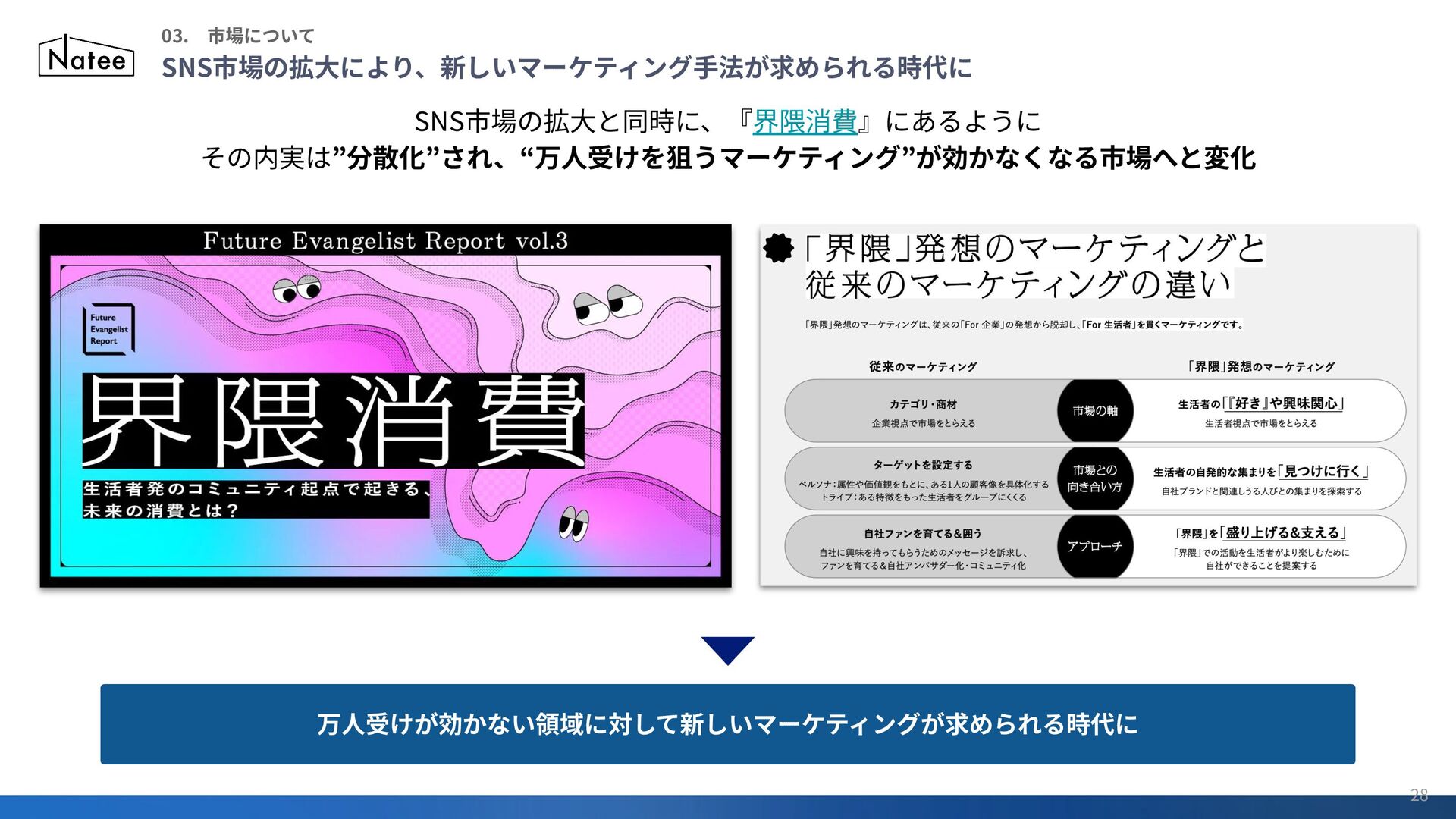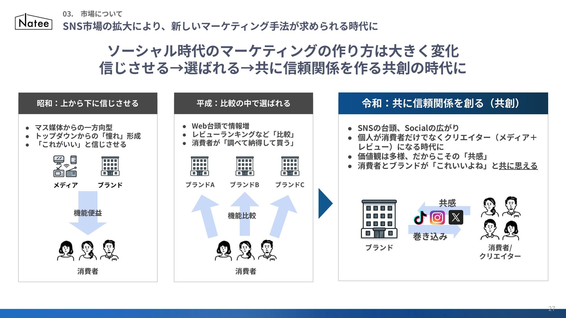 トップダウンからの「憧れ」形成 • 「これがいい」と信じさせる • Web台頭で情報増 • レビューランキングなど「⽐較」 • 消費者が「調べて納得して買う」 ブランドA 機能⽐較 ブランドB ブランドC • SNSの台頭、Socialの広がり • 個⼈が消費者だけでなくクリエイター(メディア+ レビュー)になる時代に • 価値観は多様、だからこその「共感」 • 消費者とブランドが「これいいよね」と共に思える 消費者 機能便益 メディア ブランド 消費者 ブランド 巻き込み 共感 消費者/ クリエイター SNS市場の拡⼤により、新しいマーケティング⼿法が求められる時代に