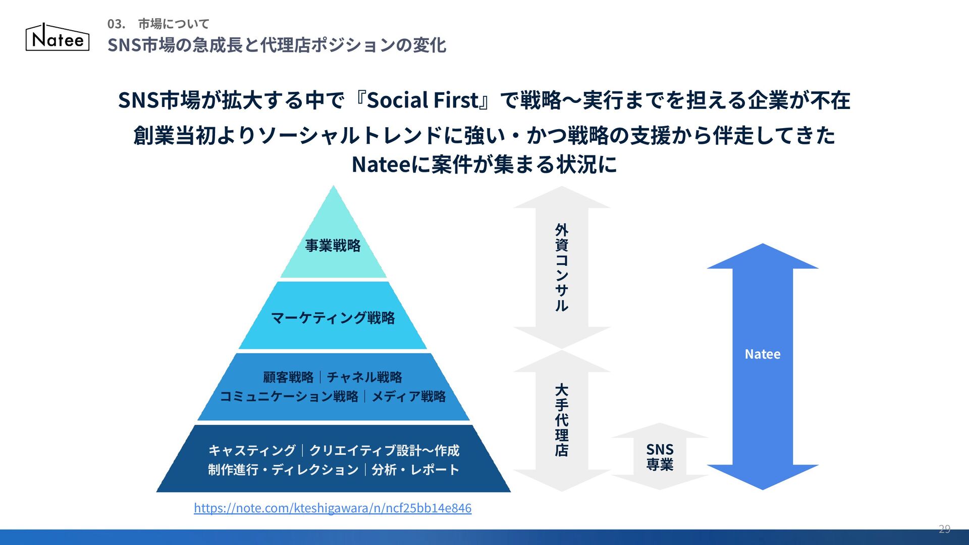 17. SNS市場の急成⻑と代理店ポジションの変化 29 SNS市場が拡⼤する中で『Social First』で戦略〜実⾏までを担える企業が不在 03. 市場について https://note.com/kteshigawara/n/ncf25bb14e846 事業戦略 マーケティング戦略 顧客戦略|チャネル戦略 コミュニケーション戦略|メディア戦略
