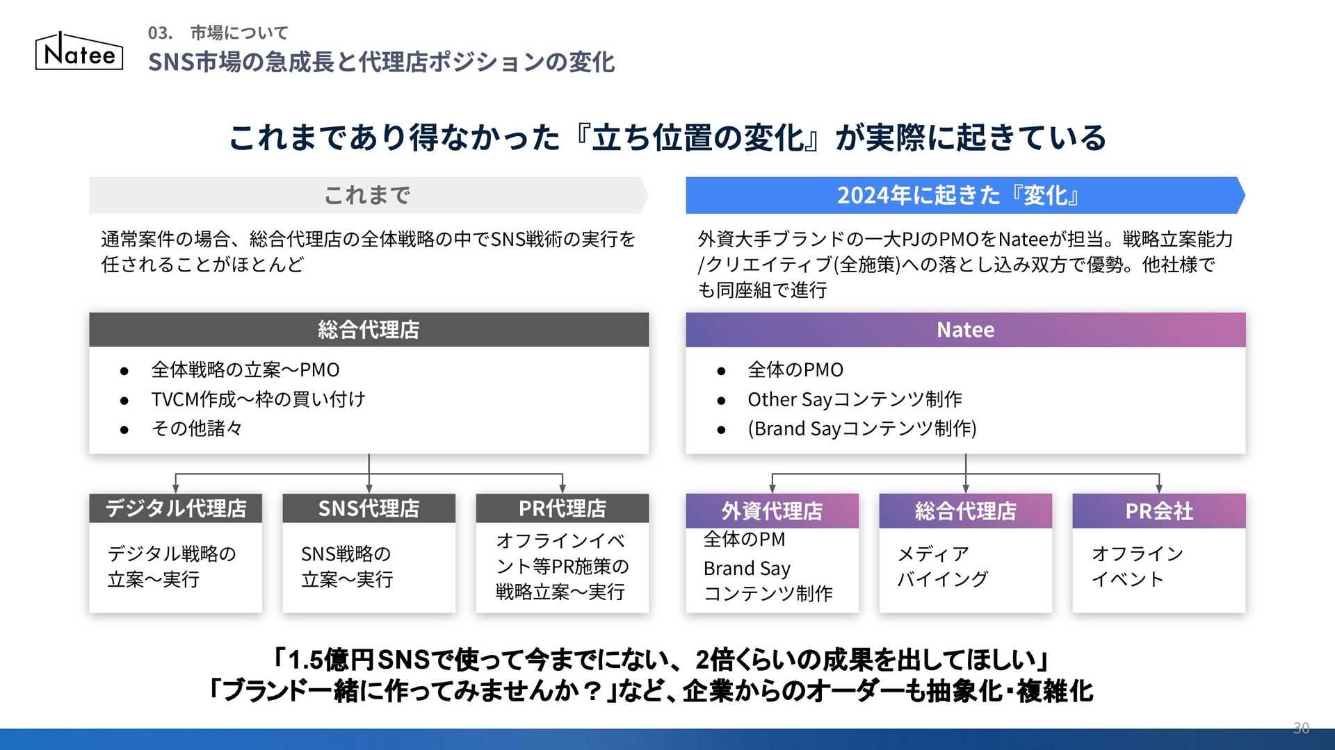 Natee 外資代理店 総合代理店 PR会社 • 全体戦略の⽴案〜PMO • TVCM作成〜枠の買い付け • その他諸々 デジタル戦略の ⽴案〜実⾏ SNS戦略の ⽴案〜実⾏ オフラインイベ ント等PR施策の 戦略⽴案〜実⾏ 通常案件の場合、総合代理店の全体戦略の中でSNS戦術の実⾏を 任されることがほとんど 外資⼤⼿ブランドの⼀⼤PJのPMOをNateeが担当。戦略⽴案能⼒ /クリエイティブ(全施策)への落とし込み双⽅で優勢。他社様で も同座組で進⾏ • 全体のPMO • Other Sayコンテンツ制作 • (Brand Sayコンテンツ制作) 全体のPM Brand Say コンテンツ制作 メディア バイイング オフライン イベント 「1.5億円SNSで使って今までにない、 2倍くらいの成果を出してほしい」 「ブランド一緒に作ってみませんか?」など、企業からのオーダーも抽象化・複雑化