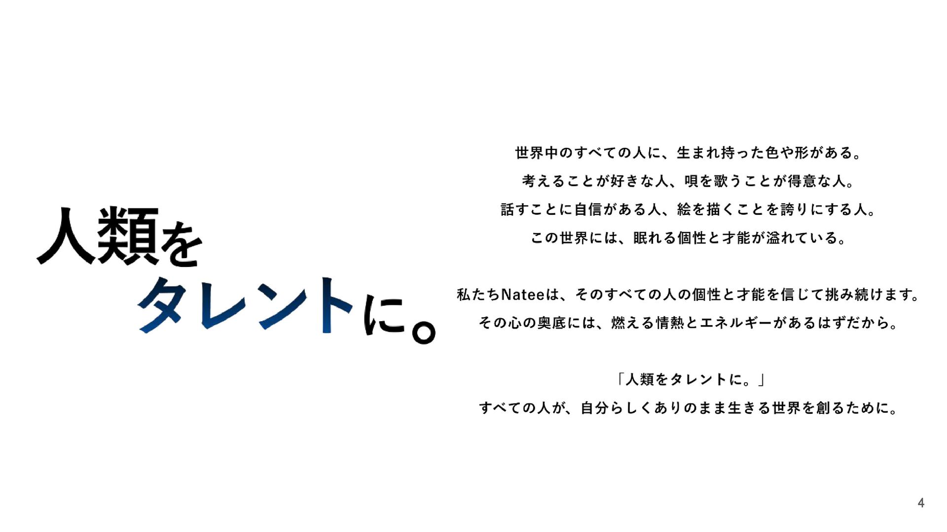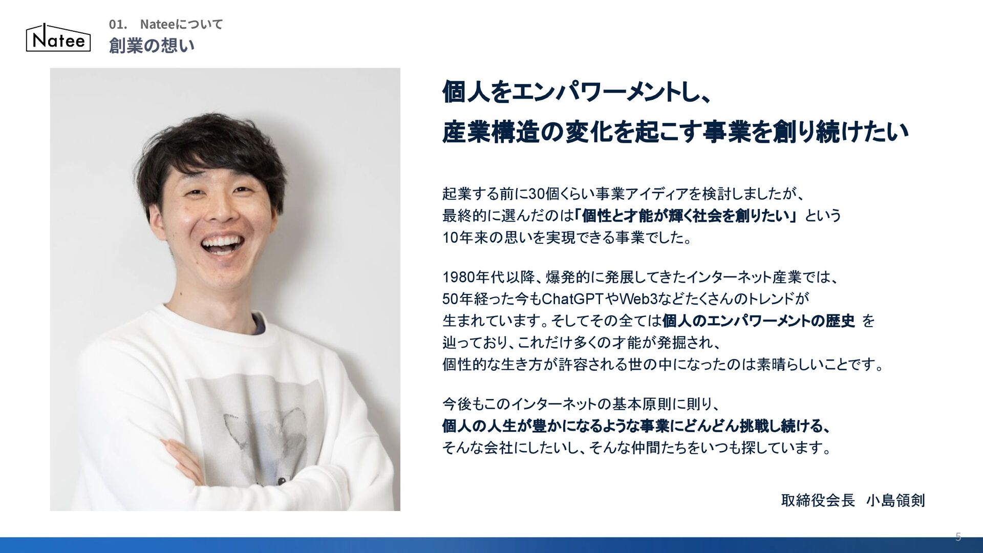 生まれています。そしてその全ては個人のエンパワーメントの歴史 を 辿っており、これだけ多くの才能が発掘され、 個性的な生き方が許容される世の中になったのは素晴らしいことです。 今後もこのインターネットの基本原則に則り、 個人の人生が豊かになるような事業にどんどん挑戦し続ける、 そんな会社にしたいし、そんな仲間たちをいつも探しています。 創業の想い 01. Nateeについて