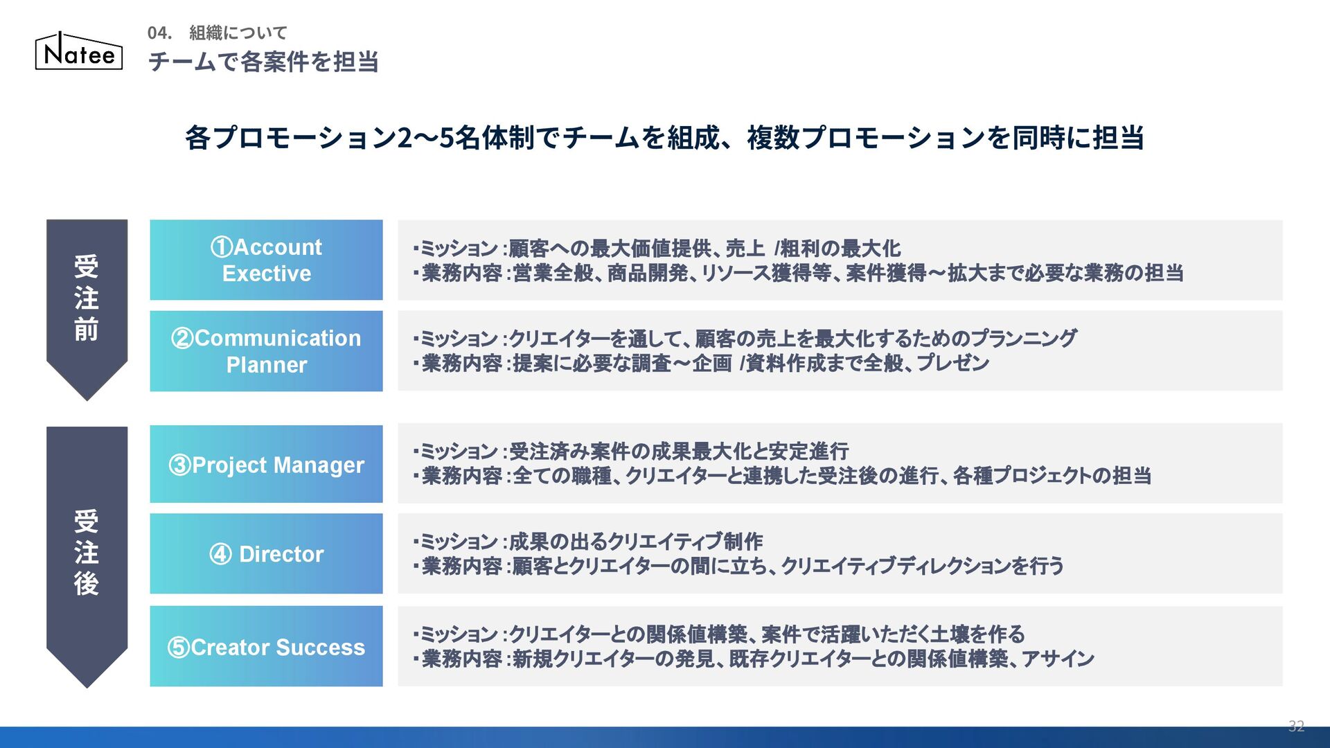 :クリエイターを通して、顧客の売上を最大化するためのプランニング ・業務内容 :提案に必要な調査~企画 /資料作成まで全般、プレゼン ・ミッション :受注済み案件の成果最大化と安定進行 ・業務内容 :全ての職種、クリエイターと連携した受注後の進行、各種プロジェクトの担当 ・ミッション :成果の出るクリエイティブ制作 ・業務内容 :顧客とクリエイターの間に立ち、クリエイティブディレクションを行う ・ミッション :クリエイターとの関係値構築、案件で活躍いただく土壌を作る ・業務内容 :新規クリエイターの発見、既存クリエイターとの関係値構築、アサイン 受 注 前 受 注 後 ①Account Exective ②Communication Planner ③Project Manager ④ Director ⑤Creator Success