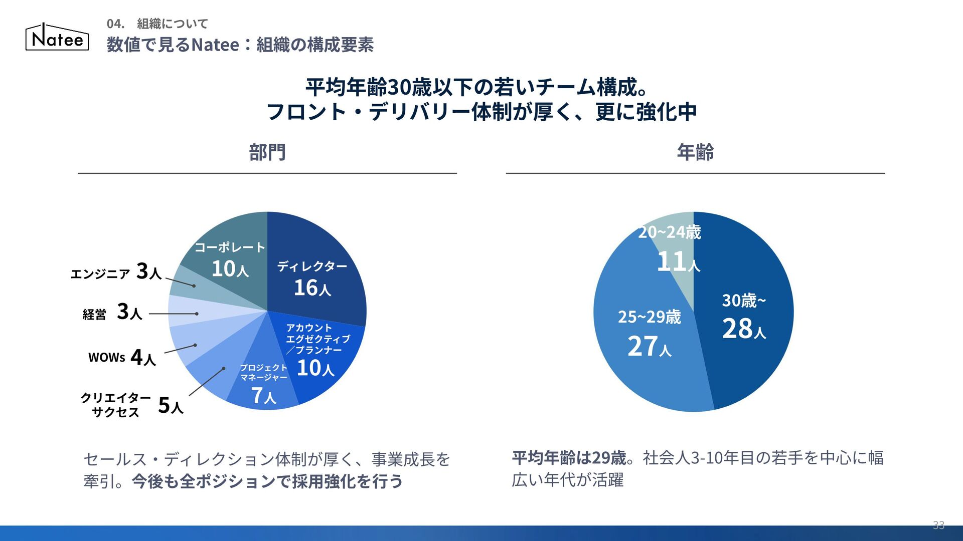 20. 数値で⾒るNatee:組織の構成要素 04. 組織について 33 平均年齢30歳以下の若いチーム構成。 フロント‧デリバリー体制が厚く、更に強化中 部⾨ 年齢 平均年齢は29歳。社会⼈3-10年⽬の若⼿を中⼼に幅 広い年代が活躍 アカウント