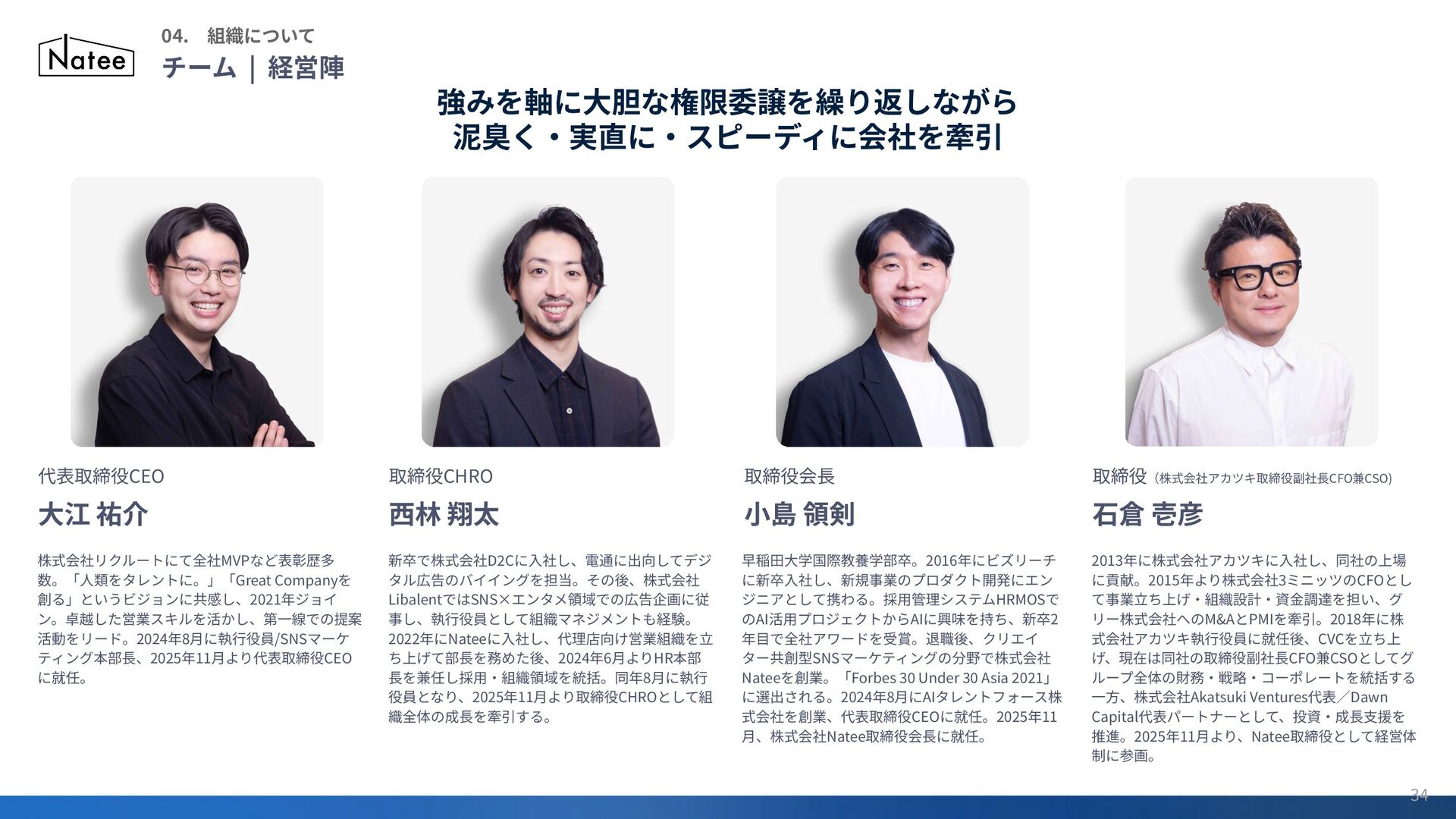 取締役CHRO ⻄林 翔太 取締役(株式会社アカツキ取締役副社⻑CFO兼CSO) ⽯倉 壱彦 早稲⽥⼤学国際教養学部卒。2016年にビズリーチ に新卒⼊社し、新規事業のプロダクト開発にエン ジニアとして携わる。採⽤管理システムHRMOSで のAI活⽤プロジェクトからAIに興味を持ち、新卒2 年⽬で全社アワードを受賞。退職後、クリエイ ター共創型SNSマーケティングの分野で株式会社 Nateeを創業。「Forbes 30 Under 30 Asia 2021」 に選出される。2024年8⽉にAIタレントフォース株 式会社を創業、代表取締役CEOに就任。2025年11 ⽉、株式会社Natee取締役会⻑に就任。 2013年に株式会社アカツキに⼊社し、同社の上場 に貢献。2015年より株式会社3ミニッツのCFOとし て事業⽴ち上げ‧組織設計‧資⾦調達を担い、グ リー株式会社へのM&AとPMIを牽引。2018年に株 式会社アカツキ執⾏役員に就任後、CVCを⽴ち上 げ、現在は同社の取締役副社⻑CFO兼CSOとしてグ ループ全体の財務‧戦略‧コーポレートを統括する ⼀⽅、株式会社Akatsuki Ventures代表∕Dawn Capital代表パートナーとして、投資‧成⻑⽀援を 推進。2025年11⽉より、Natee取締役として経営体 制に参画。 新卒で株式会社D2Cに⼊社し、電通に出向してデジ タル広告のバイイングを担当。その後、株式会社 LibalentではSNS×エンタメ領域での広告企画に従 事し、執⾏役員として組織マネジメントも経験。 2022年にNateeに⼊社し、代理店向け営業組織を⽴ ち上げて部⻑を務めた後、2024年6⽉よりHR本部 ⻑を兼任し採⽤‧組織領域を統括。同年8⽉に執⾏ 役員となり、2025年11⽉より取締役CHROとして組 織全体の成⻑を牽引する。 代表取締役CEO ⼤江 祐介 株式会社リクルートにて全社MVPなど表彰歴多 数。「⼈類をタレントに。」「Great Companyを 創る」というビジョンに共感し、2021年ジョイ ン。卓越した営業スキルを活かし、第⼀線での提案 活動をリード。2024年8⽉に執⾏役員/SNSマーケ ティング本部⻑、2025年11⽉より代表取締役CEO に就任。