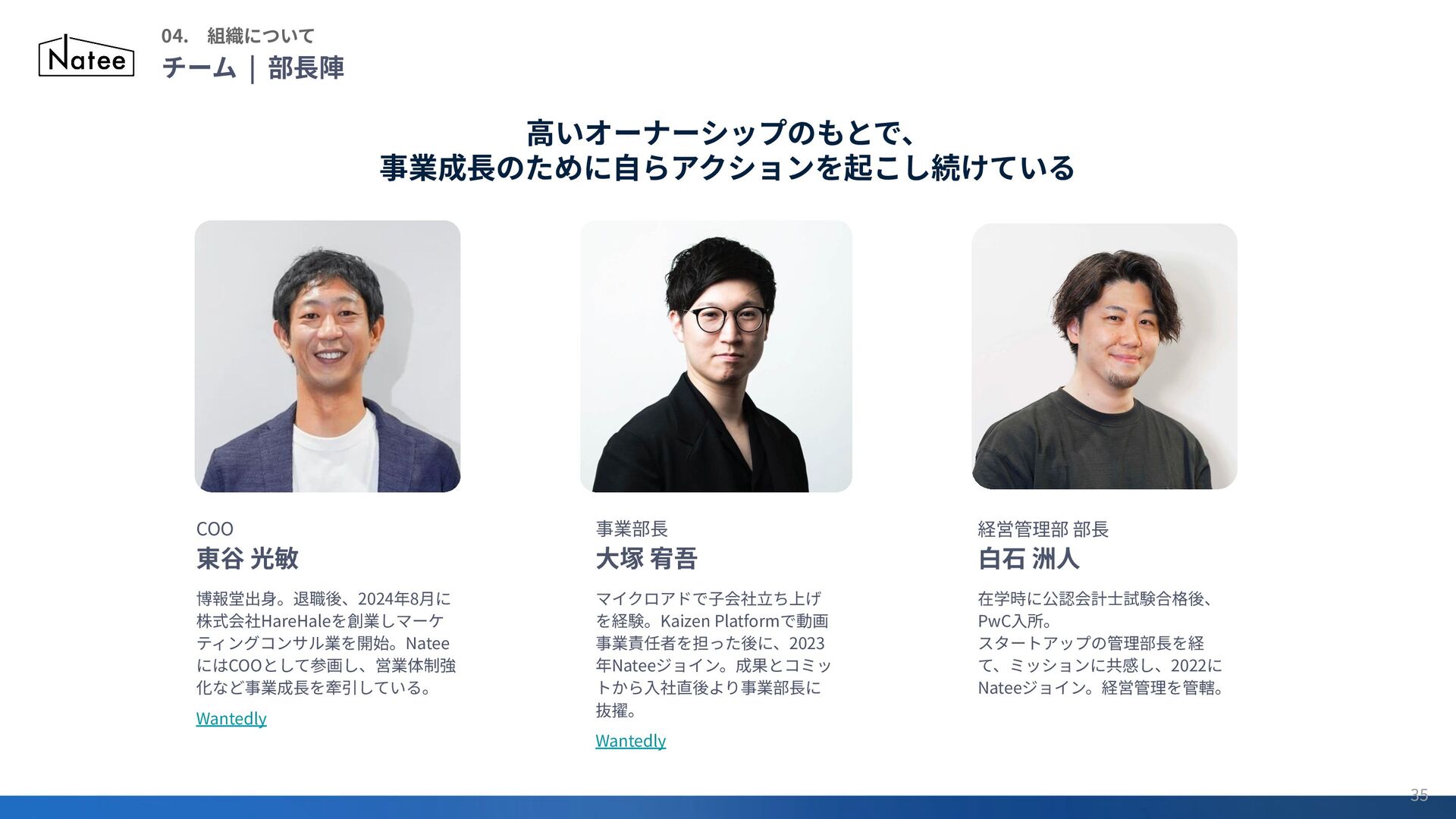 マイクロアドで⼦会社⽴ち上げ を経験。Kaizen Platformで動画 事業責任者を担った後に、2023 年Nateeジョイン。成果とコミッ トから⼊社直後より事業部⻑に 抜擢。 Wantedly 経営管理部 部⻑ ⽩⽯ 洲⼈ 在学時に公認会計⼠試験合格後、 PwC⼊所。 スタートアップの管理部⻑を経 て、ミッションに共感し、2022に Nateeジョイン。経営管理を管轄。 COO 東⾕ 光敏 博報堂出⾝。退職後、2024年8⽉に 株式会社HareHaleを創業しマーケ ティングコンサル業を開始。Natee にはCOOとして参画し、営業体制強 化など事業成⻑を牽引している。 Wantedly