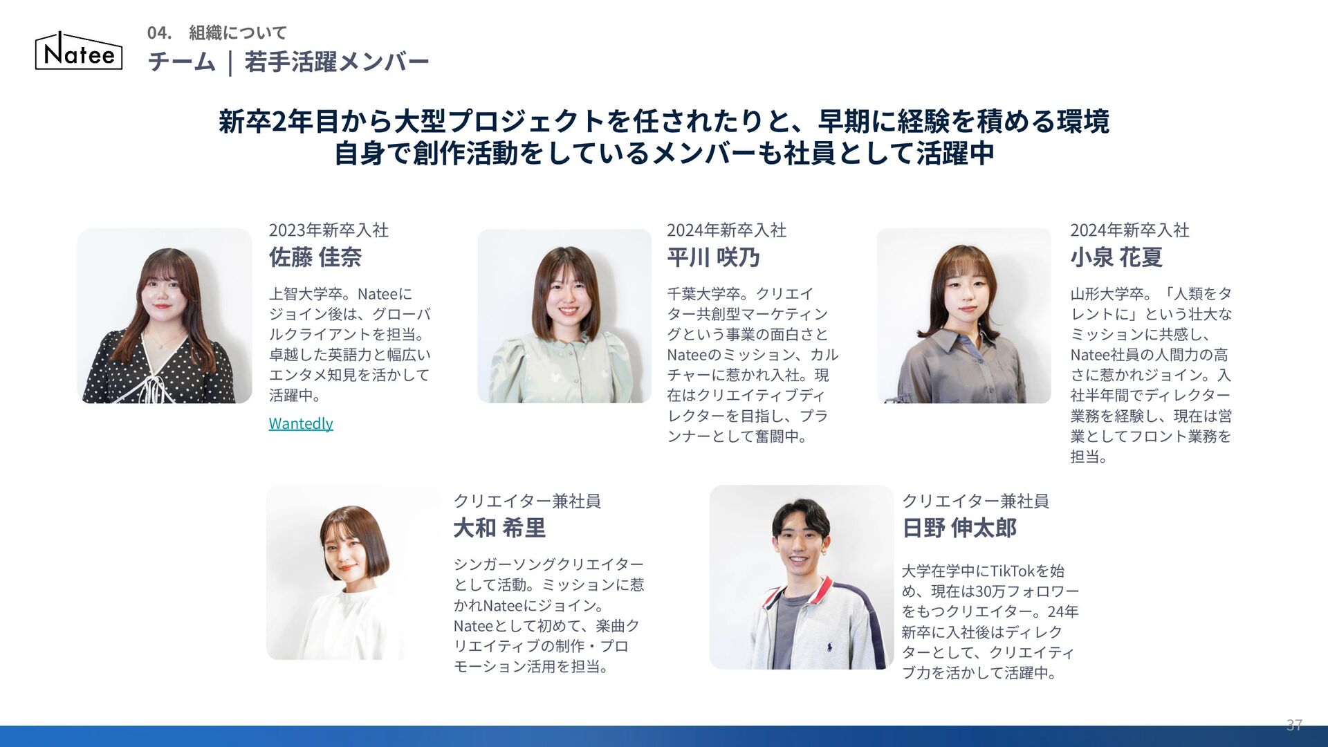 活躍中。 Wantedly 新卒2年⽬から⼤型プロジェクトを任されたりと、早期に経験を積める環境 ⾃⾝で創作活動をしているメンバーも社員として活躍中 クリエイター兼社員 ⼤和 希⾥ シンガーソングクリエイター として活動。ミッションに惹 かれNateeにジョイン。 Nateeとして初めて、楽曲ク リエイティブの制作‧プロ モーション活⽤を担当。 クリエイター兼社員 ⽇野 伸太郎 ⼤学在学中にTikTokを始 め、現在は30万フォロワー をもつクリエイター。24年 新卒に⼊社後はディレク ターとして、クリエイティ ブ⼒を活かして活躍中。 チーム | 若⼿活躍メンバー  2024年新卒⼊社 平川 咲乃 千葉⼤学卒。クリエイ ター共創型マーケティン グという事業の⾯⽩さと Nateeのミッション、カル チャーに惹かれ⼊社。現 在はクリエイティブディ レクターを⽬指し、プラ ンナーとして奮闘中。 2024年新卒⼊社 ⼩泉 花夏 ⼭形⼤学卒。「⼈類をタ レントに」という壮⼤な ミッションに共感し、 Natee社員の⼈間⼒の⾼ さに惹かれジョイン。⼊ 社半年間でディレクター 業務を経験し、現在は営 業としてフロント業務を 担当。