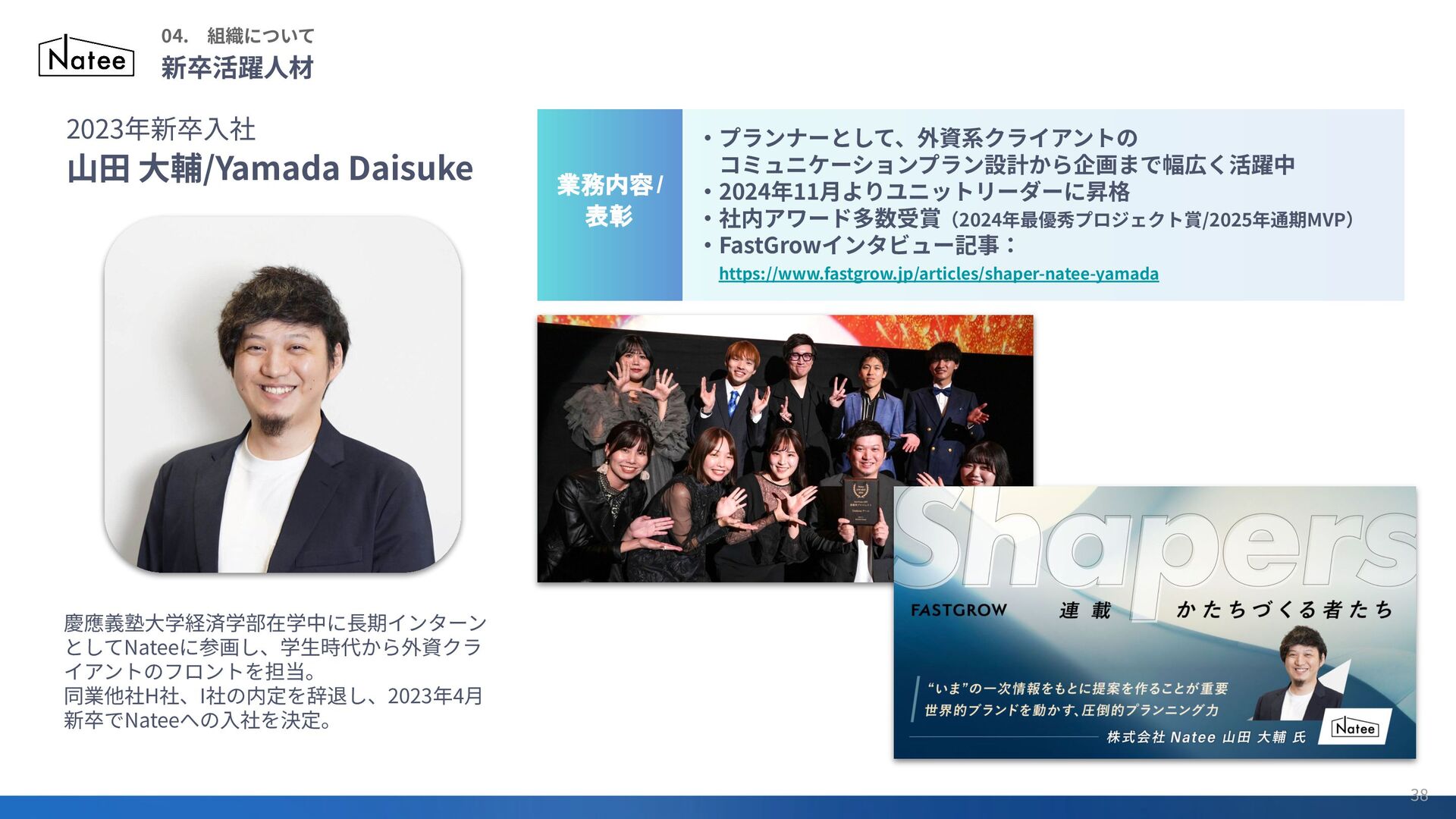 ⼭⽥ ⼤輔 Project Manager / Team leader 吉野 芙⼠ ⼤学3年時にインターン⽣と してNateeにジョイン。「⼈ とX(何か)をつなぐ架け橋 となり、誰かの⼈⽣に彩り を添える」という思いのも と、5年半にわたり従事。 2024年11⽉からPMチームの リーダーに就任。 Wantedly 慶應義塾⼤学経済学部卒。 インターンを経て23年新卒 で⼊社。 プランナーとして外資系ク ライアントのコミュニケー ションプラン設計から企画 まで幅広く活躍中。 Wantedly Strategic Planner / Manager 品川 泰嵩 東京⼤学⼤学院⼯学系研究 科卒業、2017年電通に⼊ 社。在籍中は電通デジタル に出向し、デジタルマーケ ティング業務を担務。ブラ ンディングからダイレクト まで幅広い領域に従事。 2022年にNateeに⼊社。 Wantedly Director / Unit leader 稲葉 慧 Director / Unit leader 清⽔ 彩⾹ 新卒で博報堂グループ⼊ 社、⾞や飲料メーカーのCM 制作‧YouTube制作におけ る企画‧撮影‧編集を⼀貫 して遂⾏。表現者と作り⼿ の経験を活かし、クリエイ ターさんをより輝かせたい 想いでNateeにジョイン。 Wantedly 新卒で⼊社したWeb広告代 理店にてTikTokを担当。 ミッション‧ビジョンに惹 かれ、2020年にNateeに ジョイン。⼊社後はディレ クターとして活躍、2024年 11⽉からディレクション チームのリーダーを務めて いる。 Wantedly Account Planner / Unit leader 渡邉 夏凜 ⼤学卒業後、営業職として 半導体商品を扱う専⾨商社 に⼊社。Webデザイナーを ⽬指すために退職、Natee⼊ 社後はプランナーとして活 躍し、2024年11⽉から営業 チームのユニットリーダー に就任。 Wantedly