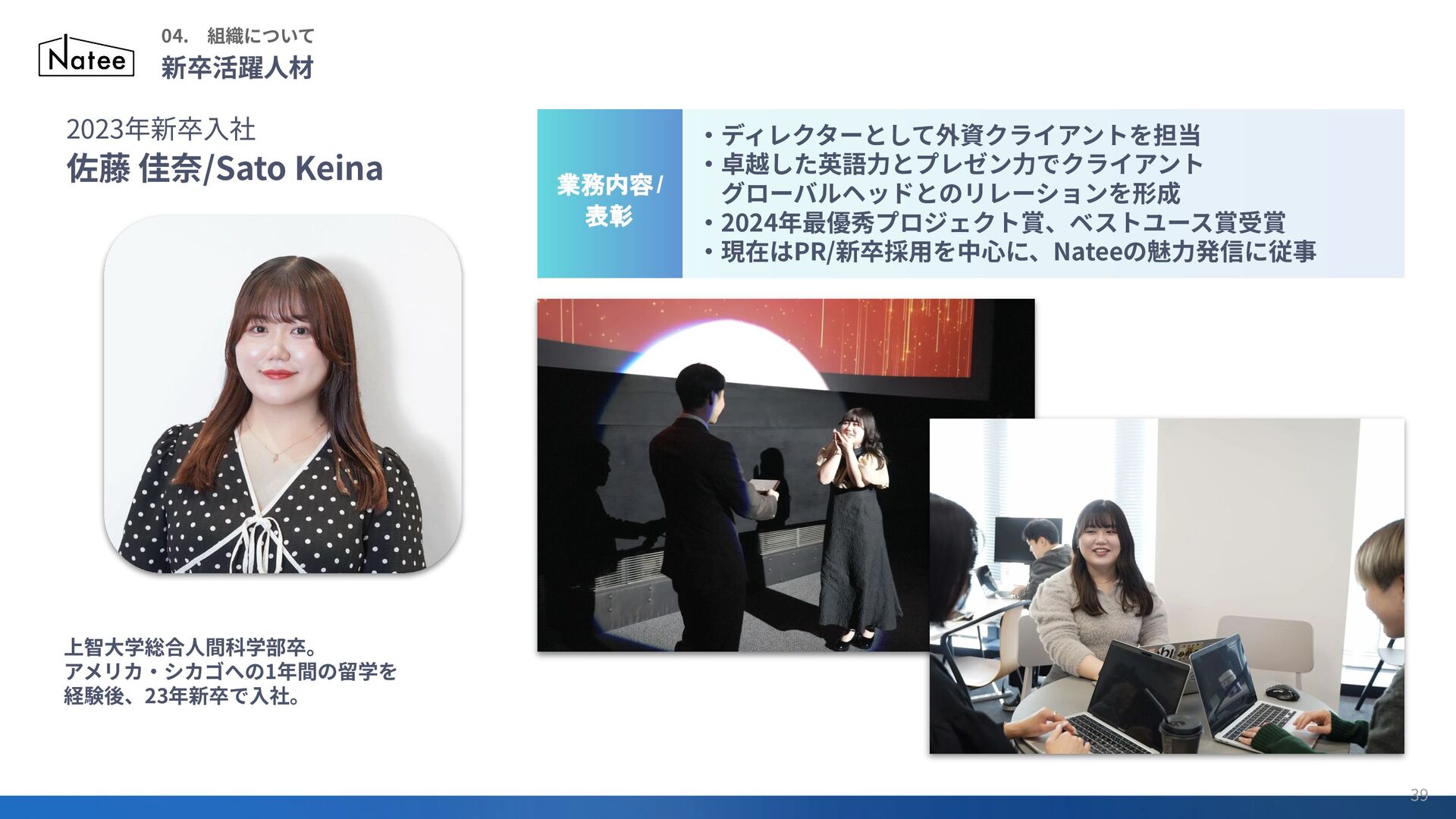 24. 04. 組織について 37 2023年新卒⼊社 佐藤 佳奈 上智⼤学卒。Nateeに ジョイン後は、グローバ ルクライアントを担当。 卓越した英語⼒と幅広い エンタメ知⾒を活かして