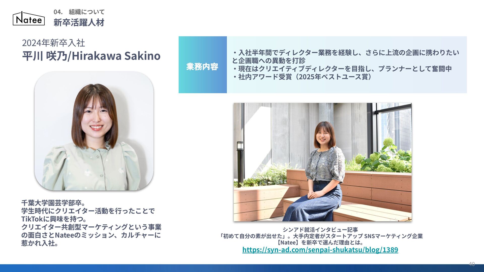 ‧現在はクリエイティブディレクターを⽬指し、プランナーとして奮闘中 ‧社内アワード受賞(2025年ベストユース賞) 業務内容 2024年新卒⼊社 平川 咲乃/Hirakawa Sakino シンアド就活インタビュー記事 「初めて⾃分の素が出せた」。⼤⼿内定者がスタートアップ SNSマーケティング企業 【Natee】を新卒で選んだ理由とは。 https://syn-ad.com/senpai-shukatsu/blog/1389 04. 組織について