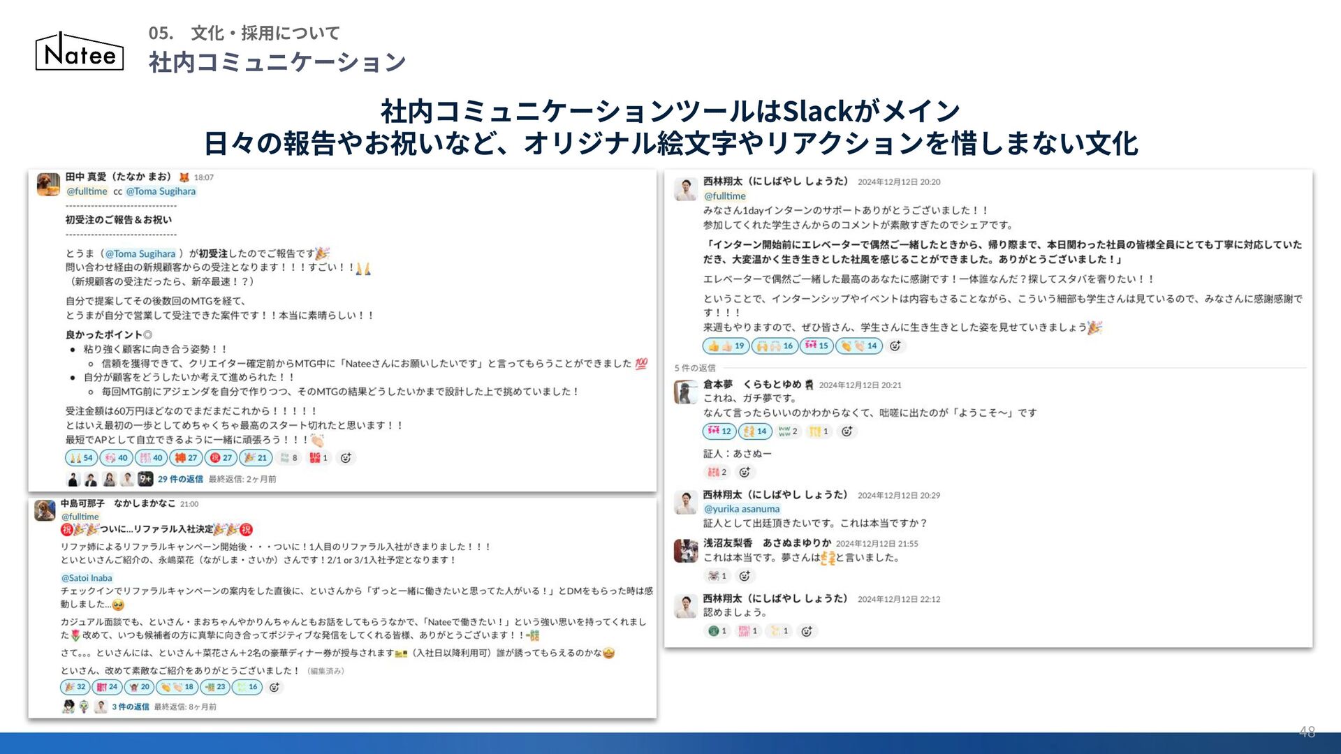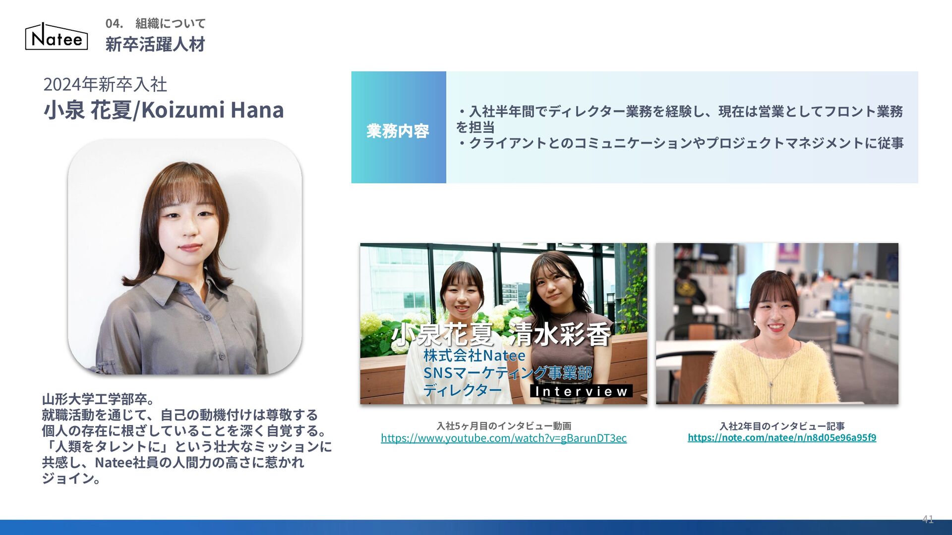 ‧クライアントとのコミュニケーションやプロジェクトマネジメントに従事 業務内容 2024年新卒⼊社 ⼩泉 花夏/Koizumi Hana ⼊社5ヶ⽉⽬のインタビュー動画 https://www.youtube.com/watch?v=gBarunDT3ec ⼊社2年⽬のインタビュー記事 https://note.com/natee/n/n8d05e96a95f9 04. 組織について