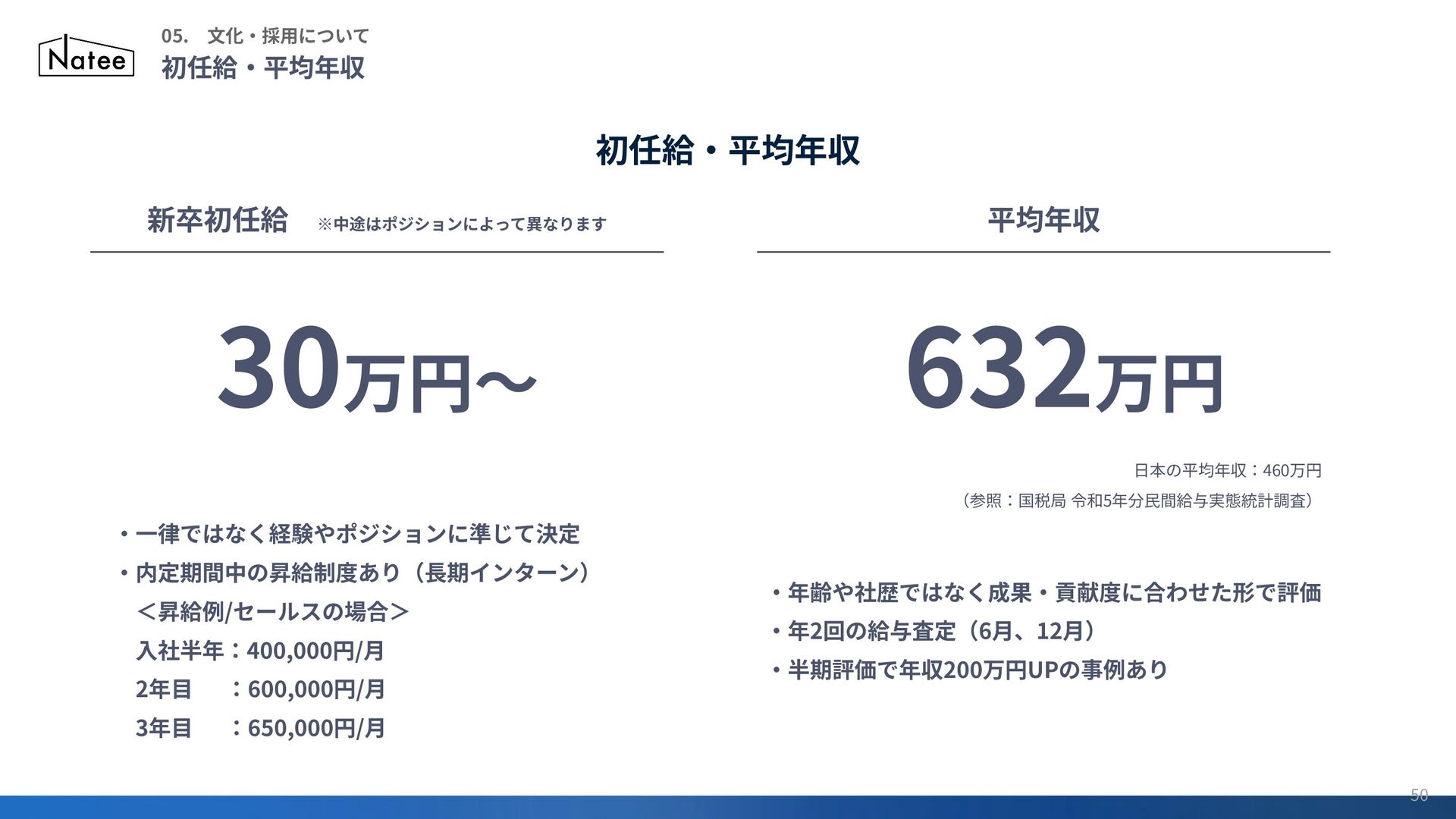 28. 初任給‧平均年収 05. ⽂化‧採⽤について 50 初任給‧平均年収 平均年収 ‧年齢や社歴ではなく成果‧貢献度に合わせた形で評価 ‧年2回の給与査定(6⽉、12⽉) ‧半期評価で年収200万円UPの事例あり 632万円 ⽇本の平均年収:460万円