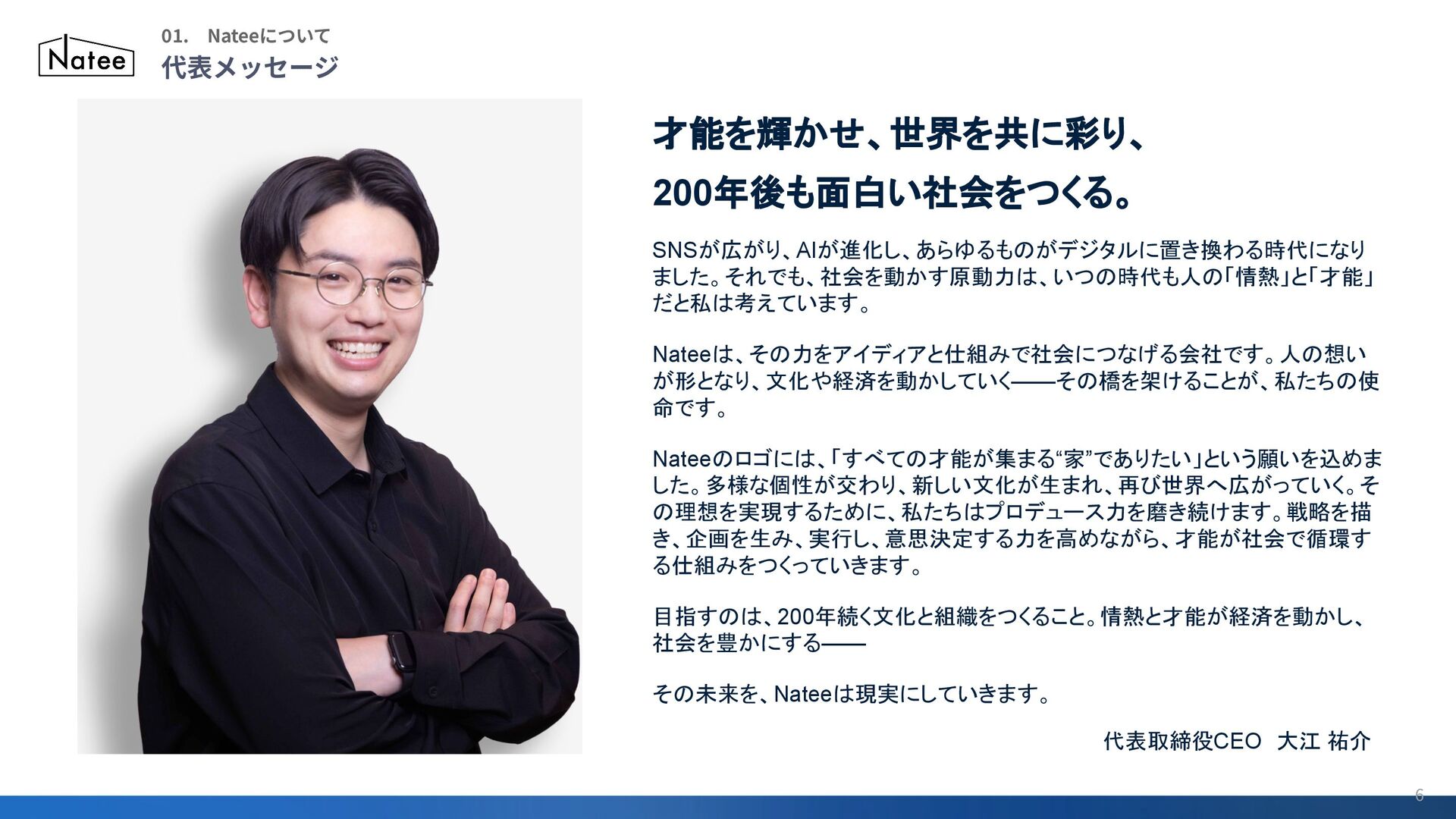 4. 6 代表取締役CEO 大江 祐介 才能を輝かせ、世界を共に彩り、 200年後も面白い社会をつくる。 SNSが広がり、AIが進化し、あらゆるものがデジタルに置き換わる時代になり ました。それでも、社会を動かす原動力は、いつの時代も人の「情熱」と「才能」 だと私は考えています。 Nateeは、その力をアイディアと仕組みで社会につなげる会社です。人の想い が形となり、文化や経済を動かしていく——その橋を架けることが、私たちの使