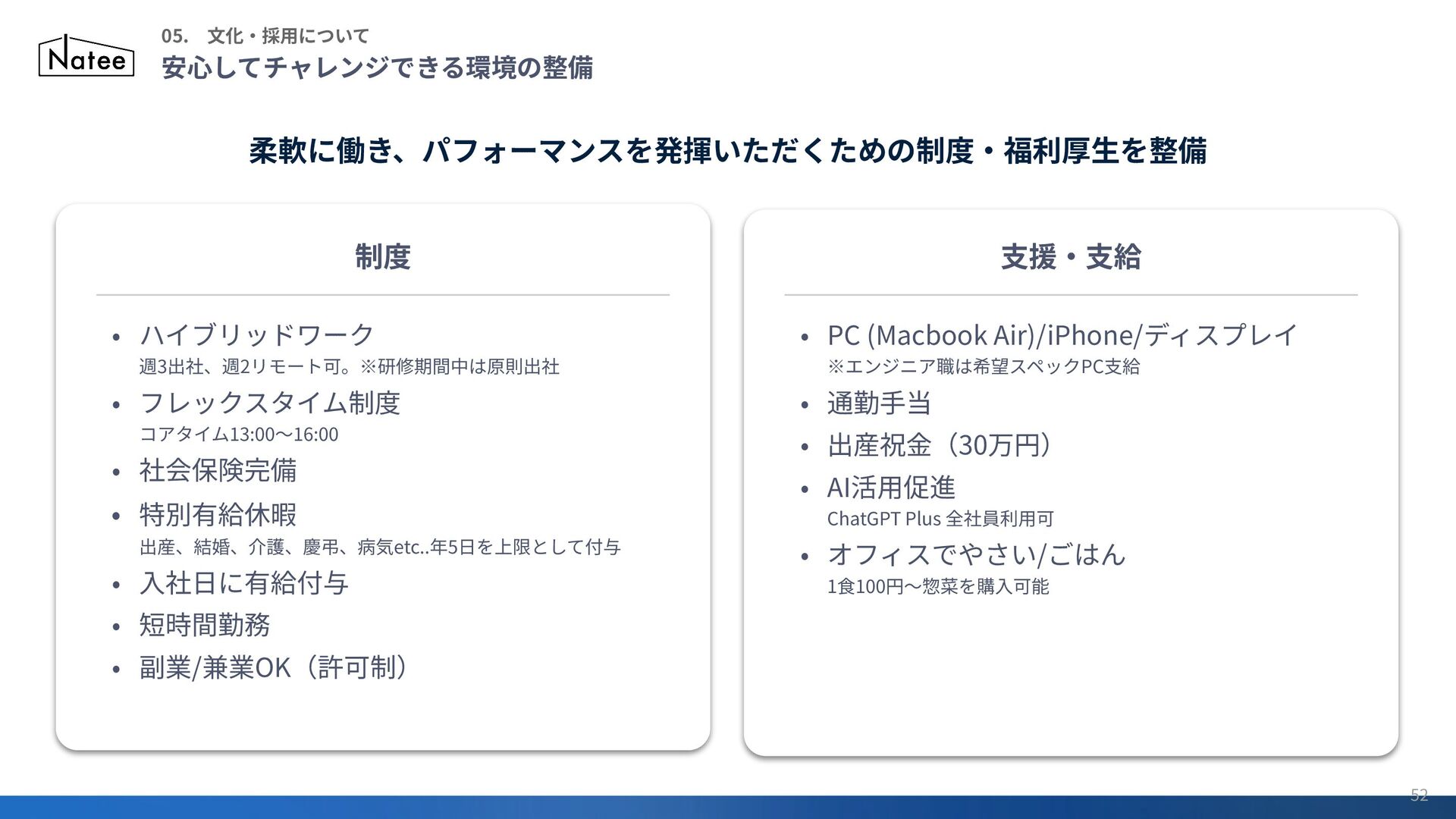 コアタイム13:00〜16:00 • 社会保険完備 • 特別有給休暇 出産、結婚、介護、慶弔、病気etc..年5⽇を上限として付与 • ⼊社⽇に有給付与 • 短時間勤務 • 副業/兼業OK(許可制) • PC (Macbook Air)/iPhone/ディスプレイ ※エンジニア職は希望スペックPC⽀給 • 通勤⼿当 • 出産祝⾦(30万円) • AI活⽤促進 ChatGPT Plus 全社員利⽤可 • オフィスでやさい/ごはん 1⾷100円〜惣菜を購⼊可能 05. ⽂化‧採⽤について