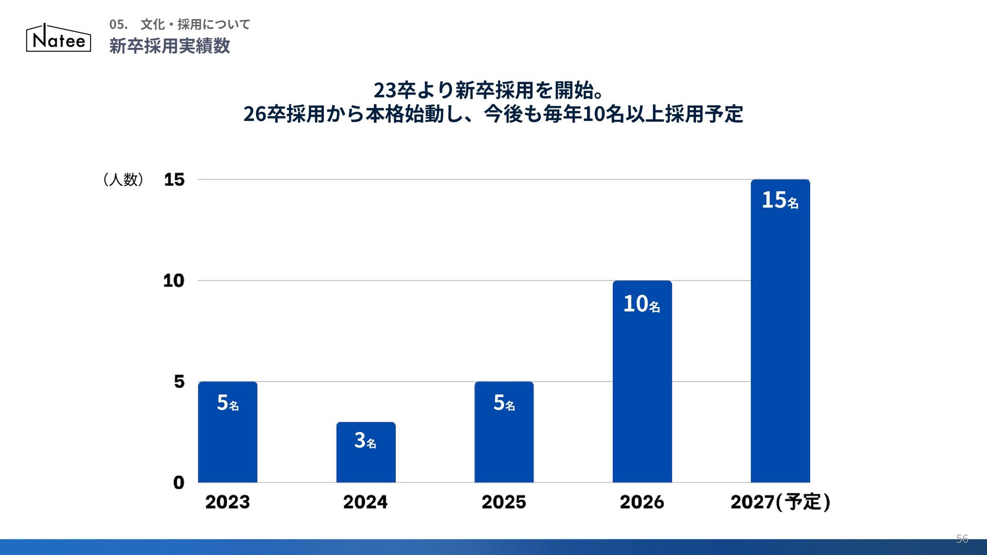 30. 53 新卒:⼊社前〜⼊社後の研修の流れ 05. ⽂化‧採⽤について 内定承諾後、⼊社まで定期的に実施 会社理解‧職種理解‧ ツール研修など 本⼈の希望や適性を踏まえて初期配属を決定 各チームでトレーナー(先輩社員)が専属でOJT 業務習得と振り返り⽀援を通じて⾃⾛できる状態へ トレーナー+上⻑が連携し、定量∕定性の