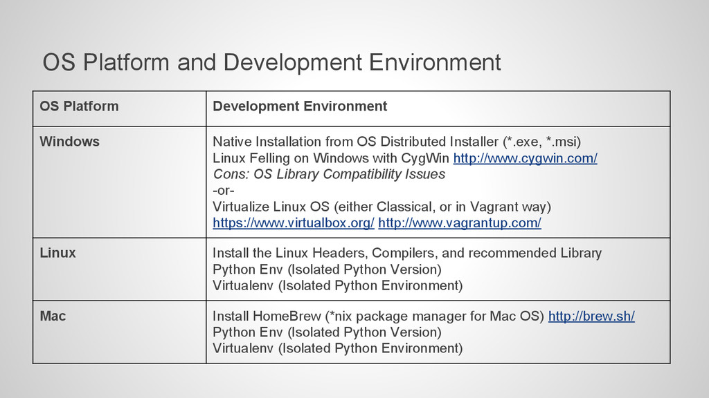 Native Installation from OS Distributed Installer (*.exe, *.msi) Linux Felling on Windows with CygWin http://www.cygwin.com/ Cons: OS Library Compatibility Issues -or- Virtualize Linux OS (either Classical, or in Vagrant way) https://www.virtualbox.org/ http://www.vagrantup.com/ Linux Install the Linux Headers, Compilers, and recommended Library Python Env (Isolated Python Version) Virtualenv (Isolated Python Environment) Mac Install HomeBrew (*nix package manager for Mac OS) http://brew.sh/ Python Env (Isolated Python Version) Virtualenv (Isolated Python Environment)
