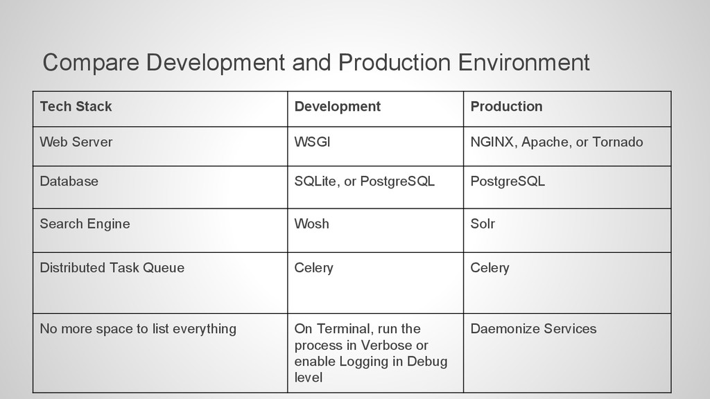 Server WSGI NGINX, Apache, or Tornado Database SQLite, or PostgreSQL PostgreSQL Search Engine Wosh Solr Distributed Task Queue Celery Celery No more space to list everything On Terminal, run the process in Verbose or enable Logging in Debug level Daemonize Services
