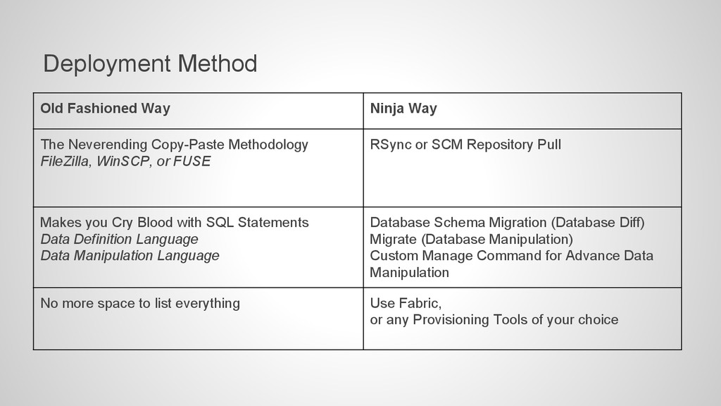 Methodology FileZilla, WinSCP, or FUSE RSync or SCM Repository Pull Makes you Cry Blood with SQL Statements Data Definition Language Data Manipulation Language Database Schema Migration (Database Diff) Migrate (Database Manipulation) Custom Manage Command for Advance Data Manipulation No more space to list everything Use Fabric, or any Provisioning Tools of your choice