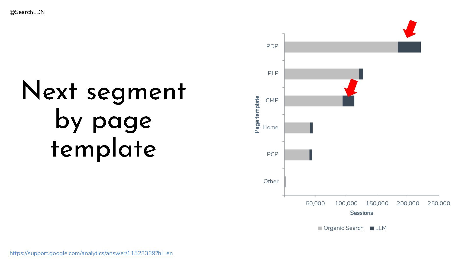 PLP PDP Sessions Page template Organic Search LLM Next segment by page template https://support.google.com/analytics/answer/11523339?hl=en